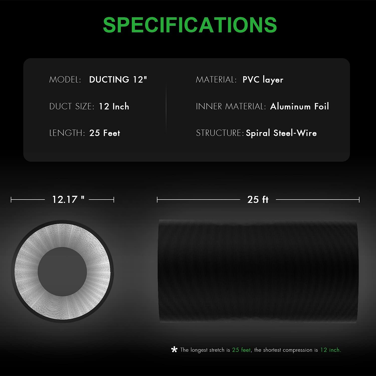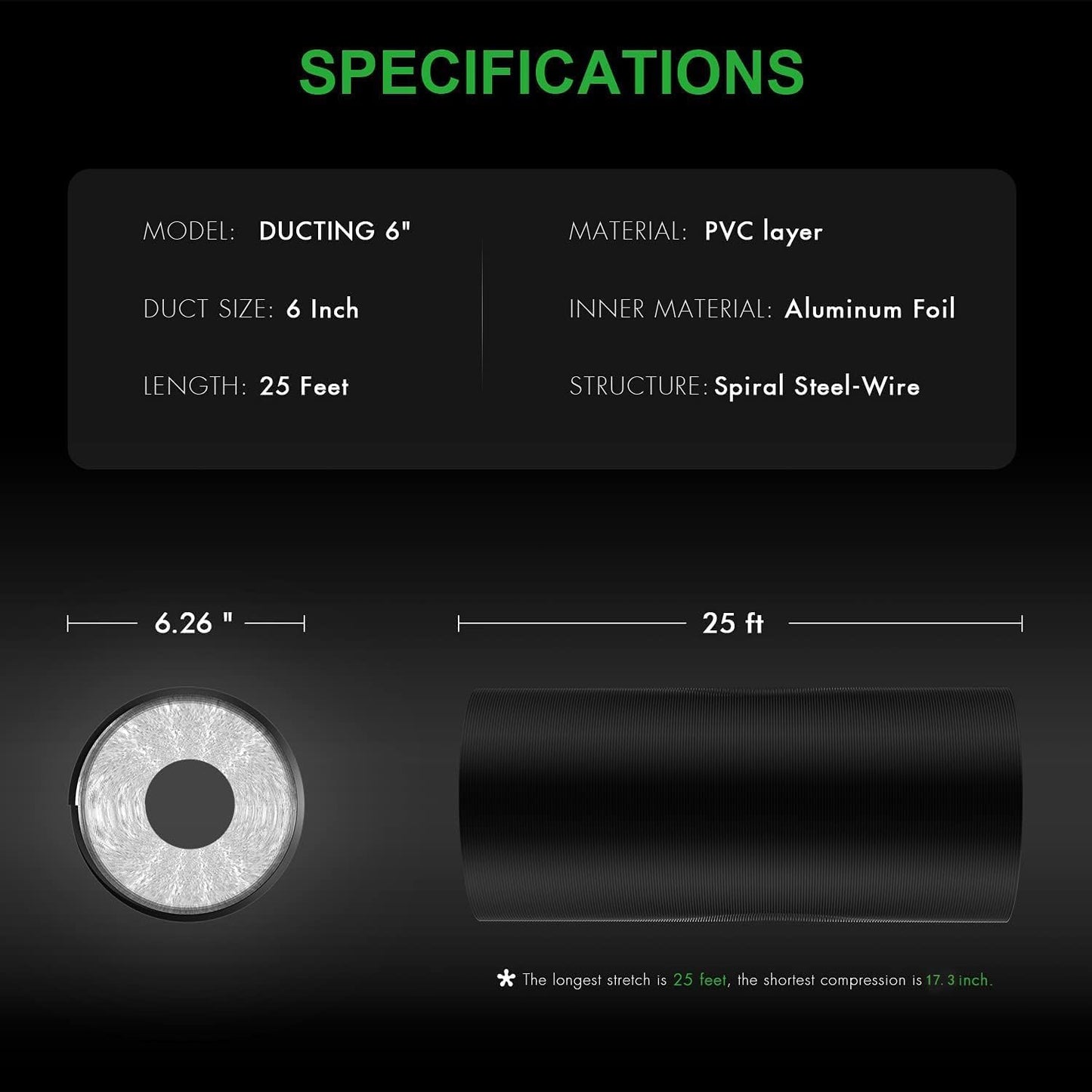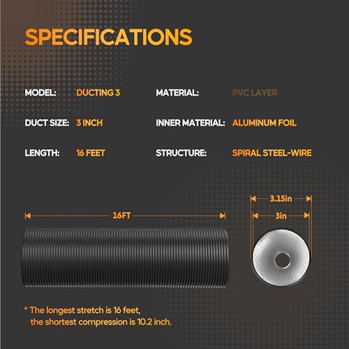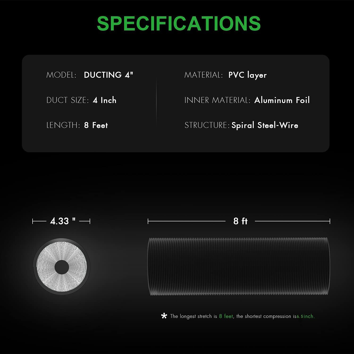 - Ducting: 4 inch (diameter) x 25 feet (length) when fully extended. Temperature endurance range from 0 ~ 185°F (-18℃ ~ 85℃). Flexible ventilation ducting made from high-quality flame-retardant aluminum