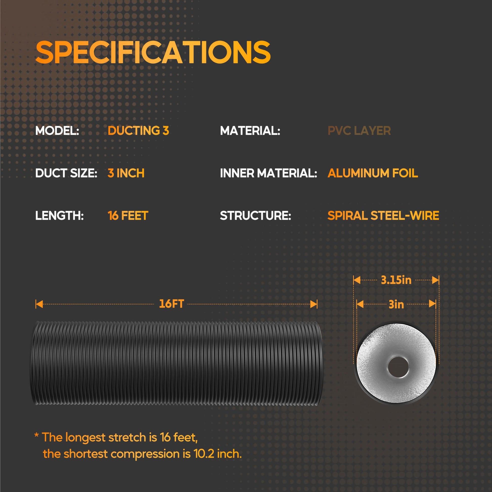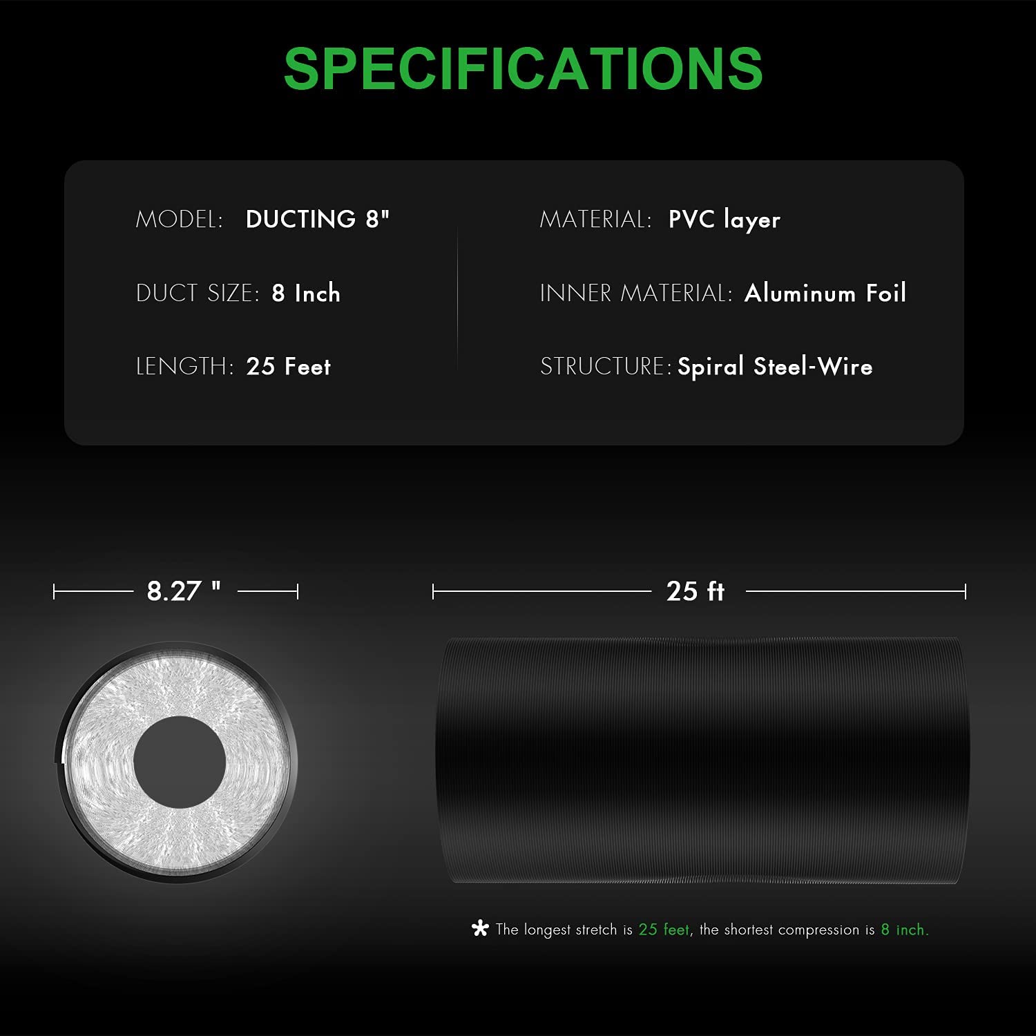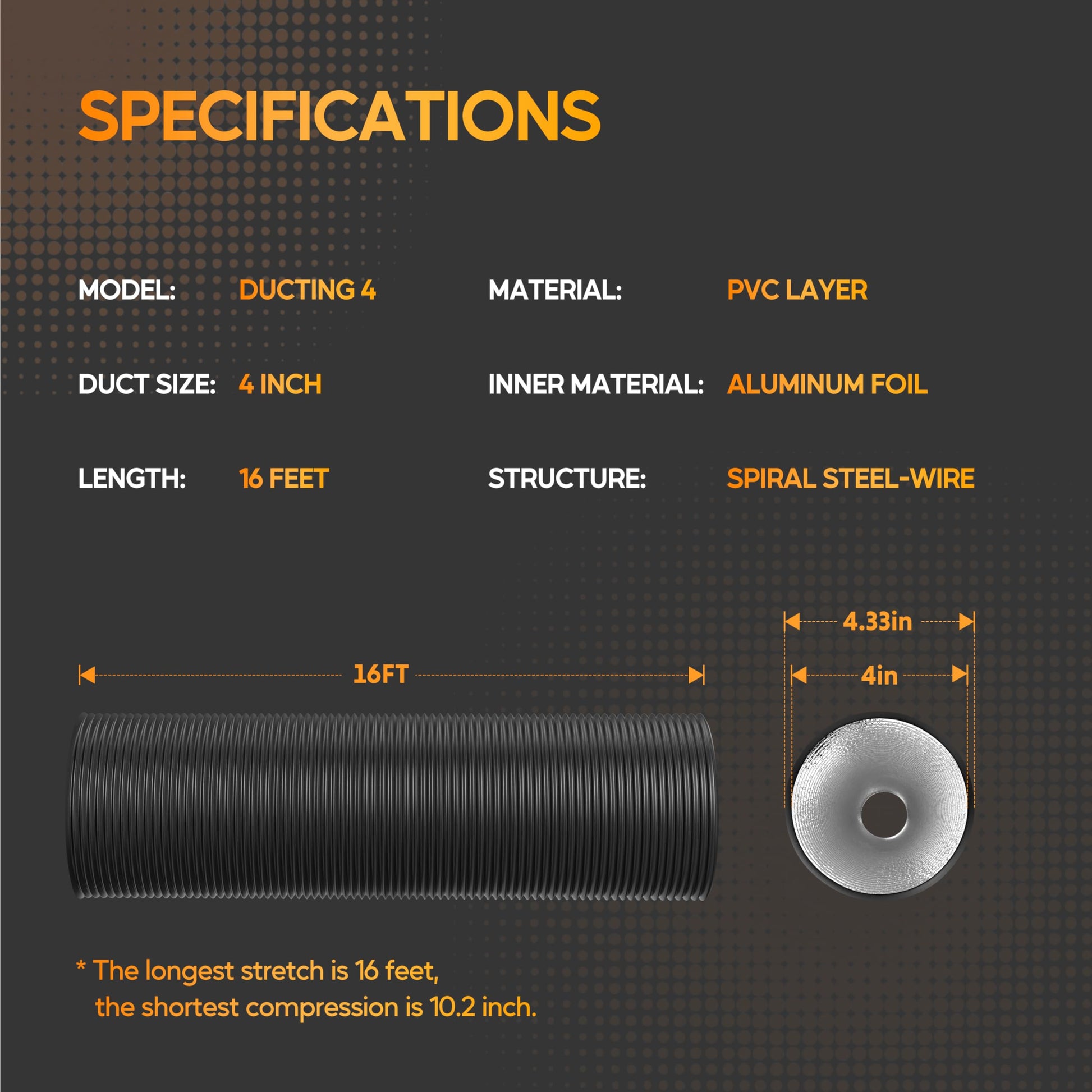 - Ducting: 4 inch (diameter) x 25 feet (length) when fully extended. Temperature endurance range from 0 ~ 185°F (-18℃ ~ 85℃). Flexible ventilation ducting made from high-quality flame-retardant aluminum