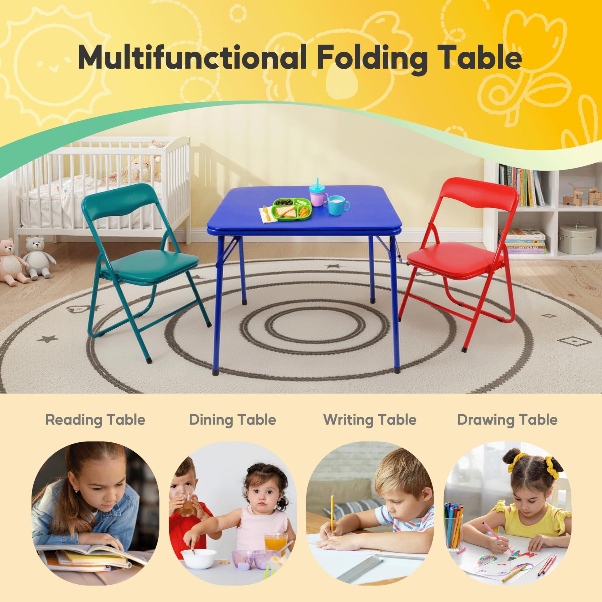 - High-quality construction: Crafted from premium steel, this card table ensures durability for years. Ideal for use as a kids desk chair setup or a folding desk in a classroom, it withstands the rigors of active play and study time.