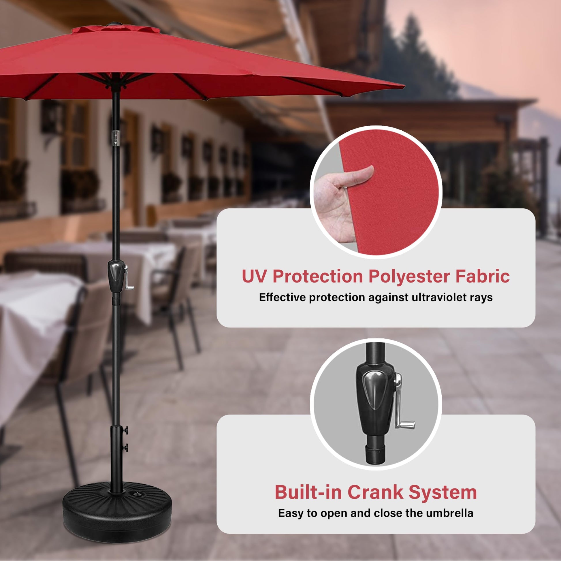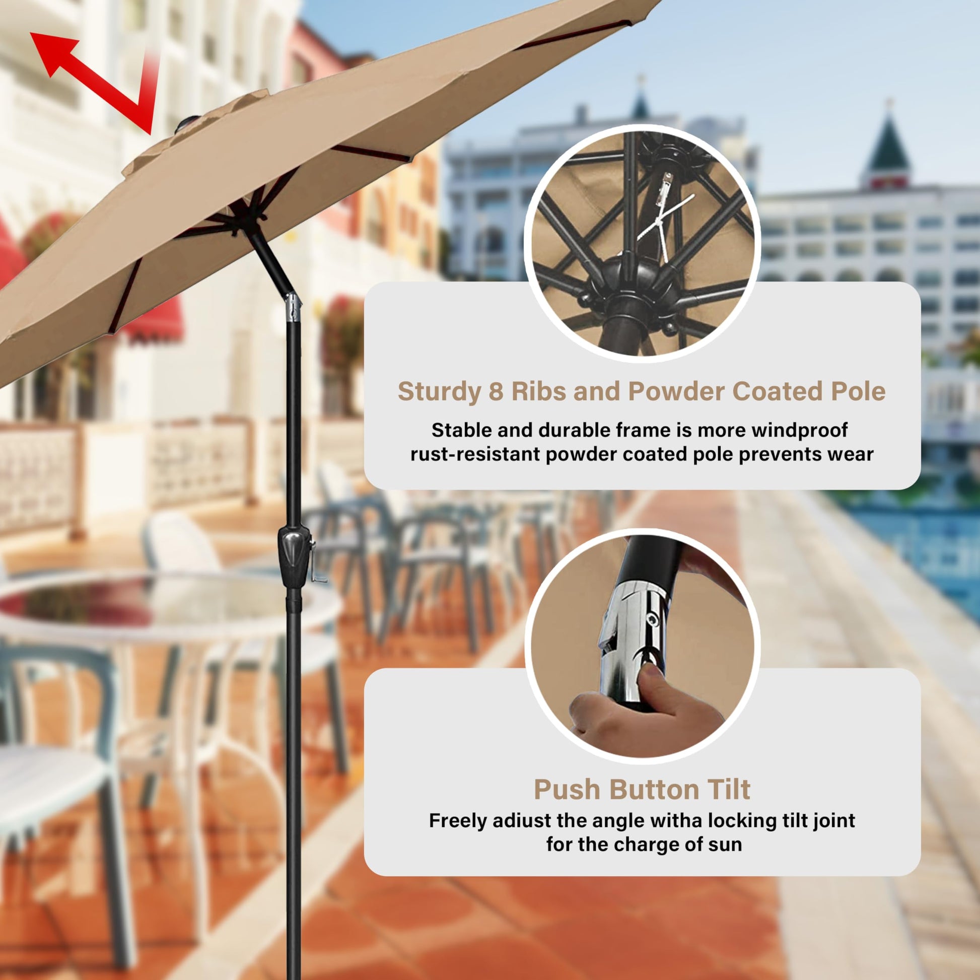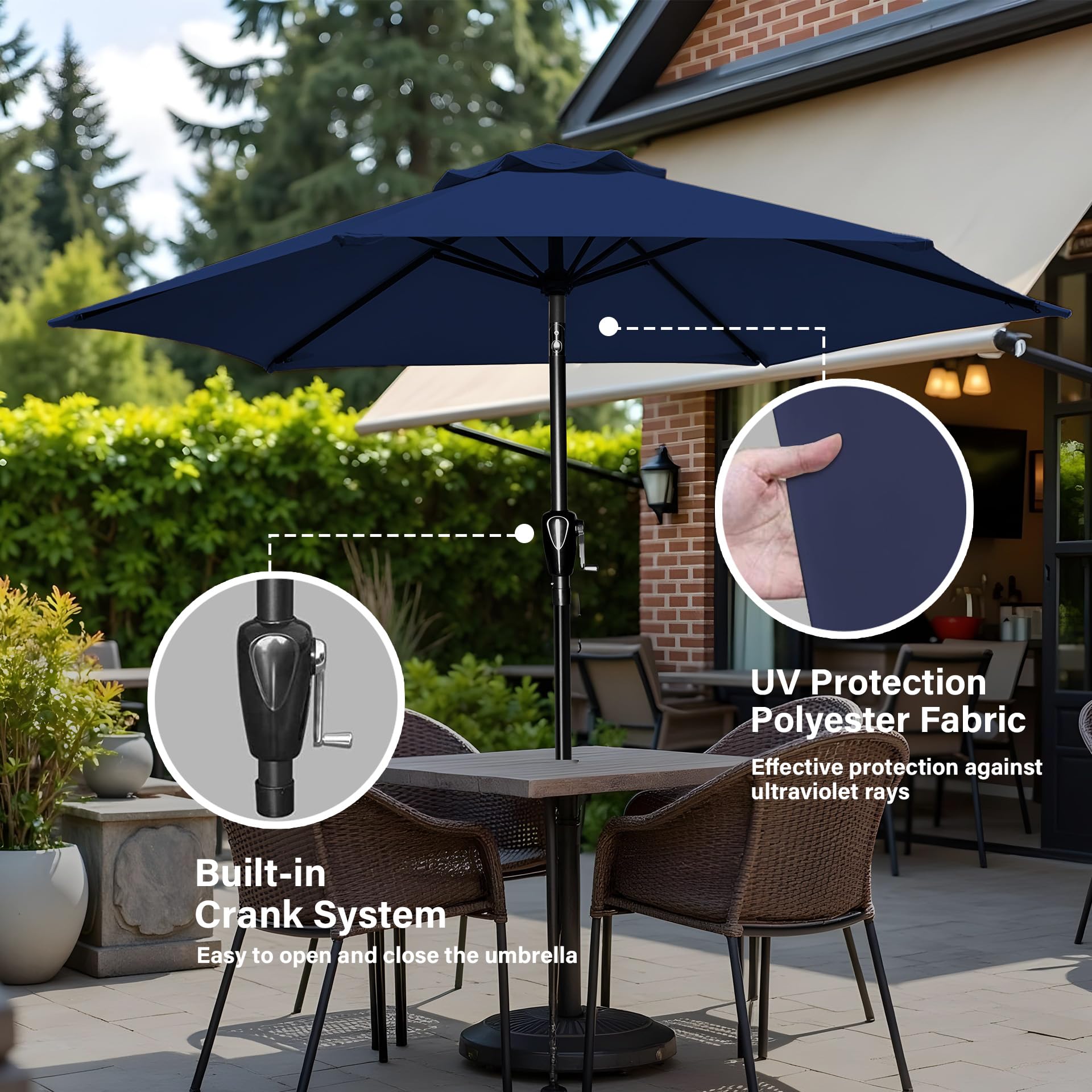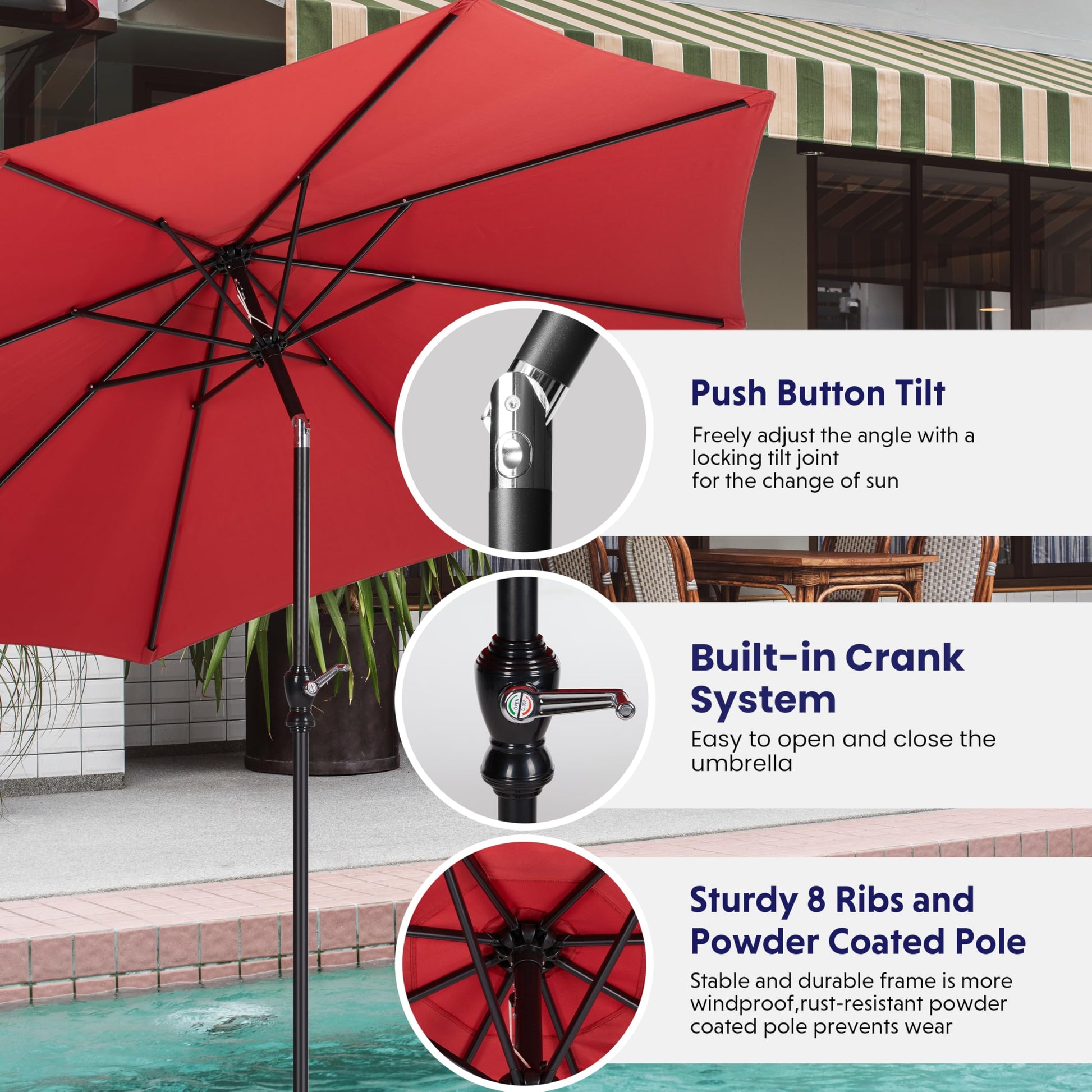 - Crank Mechanism: This market umbrella is designed with crank system for easy opening and quick use. Push button tilt for more angles of shading, keep you away from the sun all day.