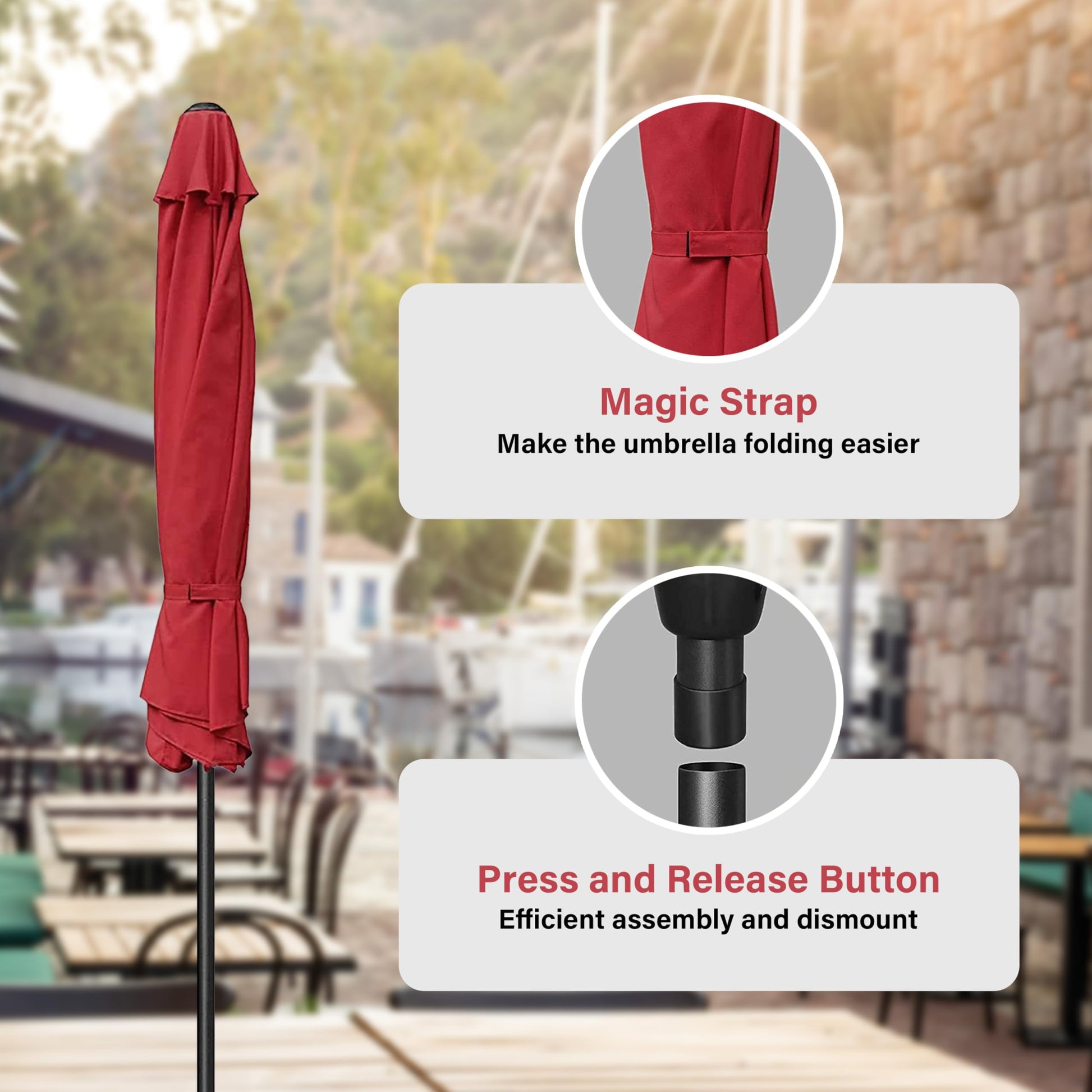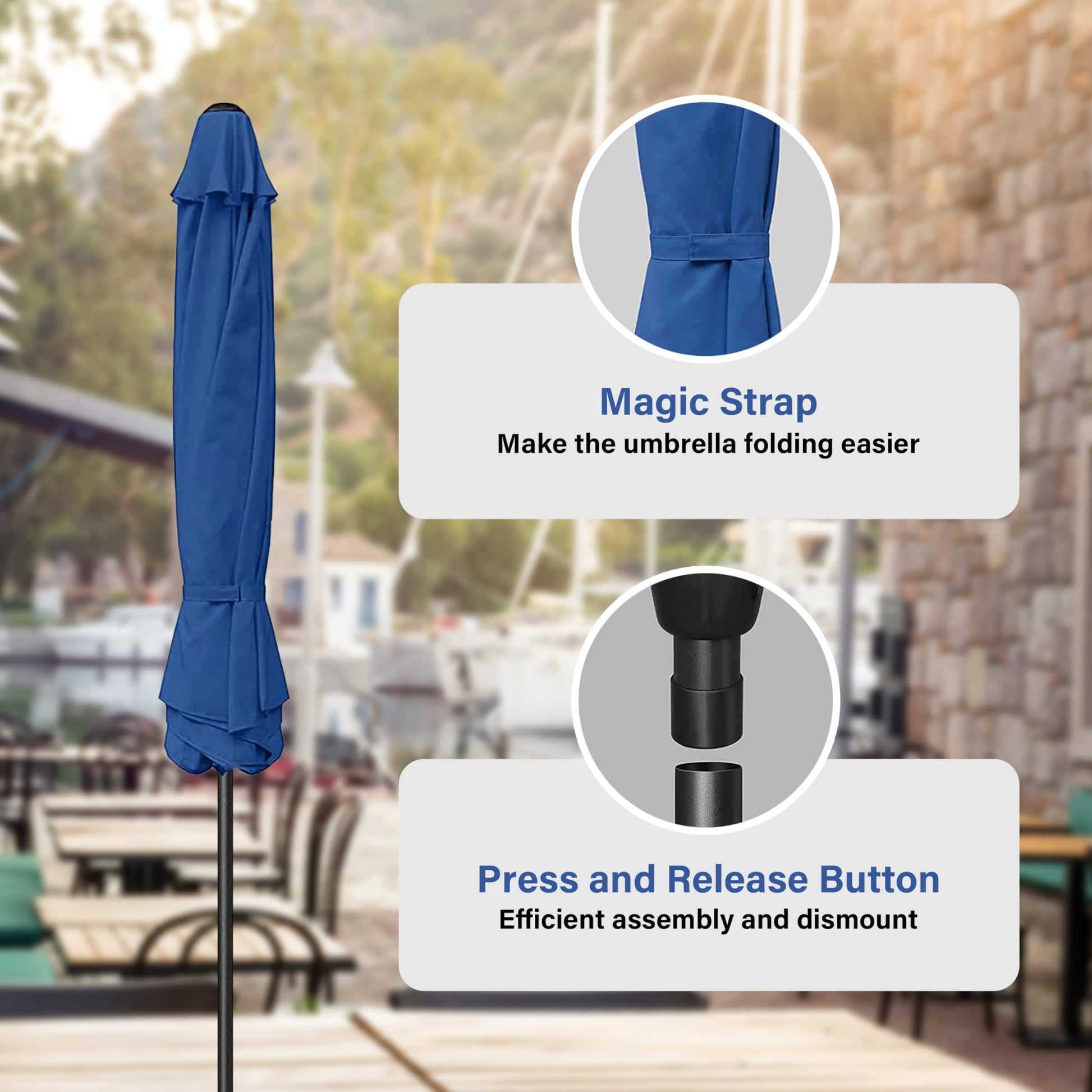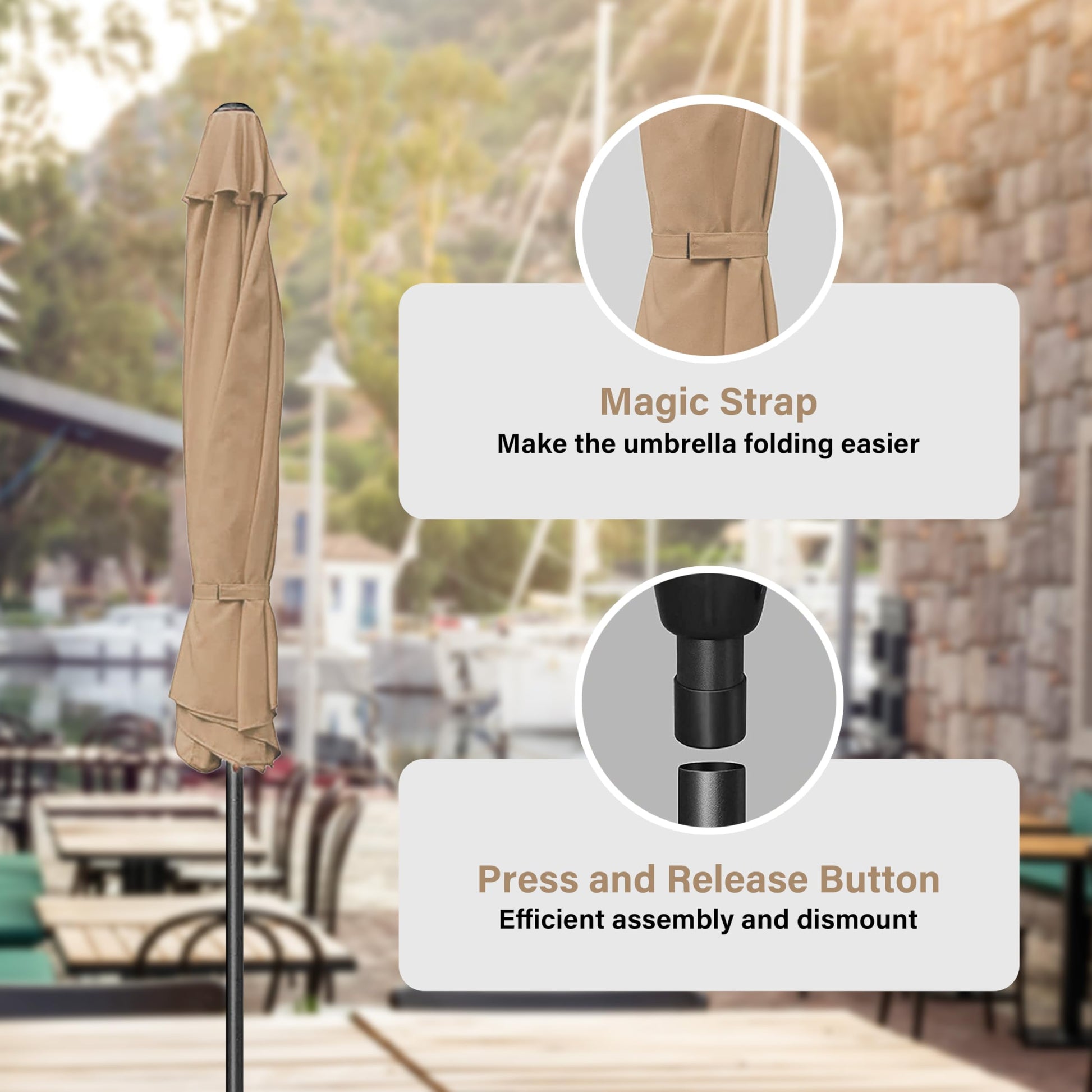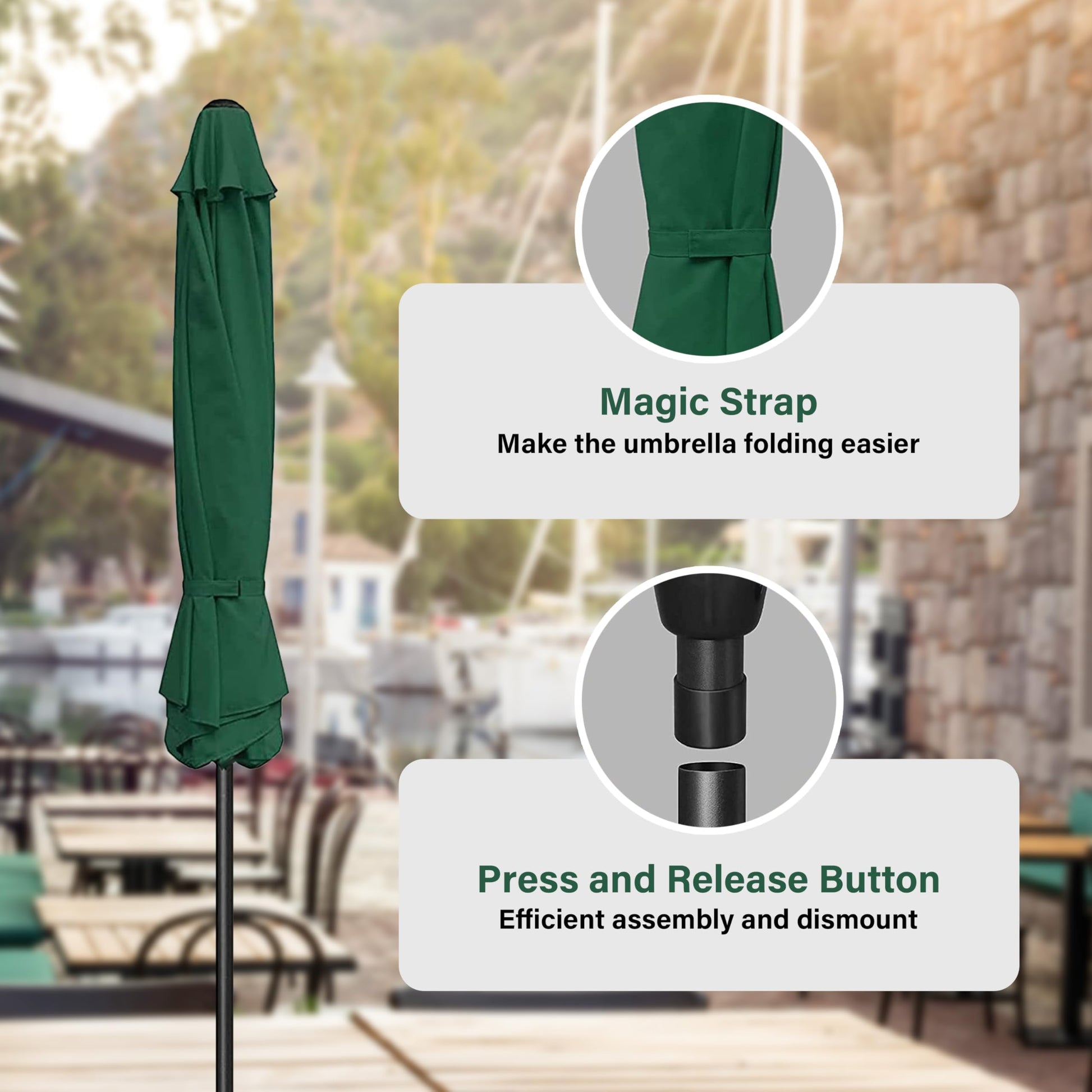 - Crank Mechanism: This market umbrella is designed with crank system for easy opening and quick use. Push button tilt for more angles of shading, keep you away from the sun all day.