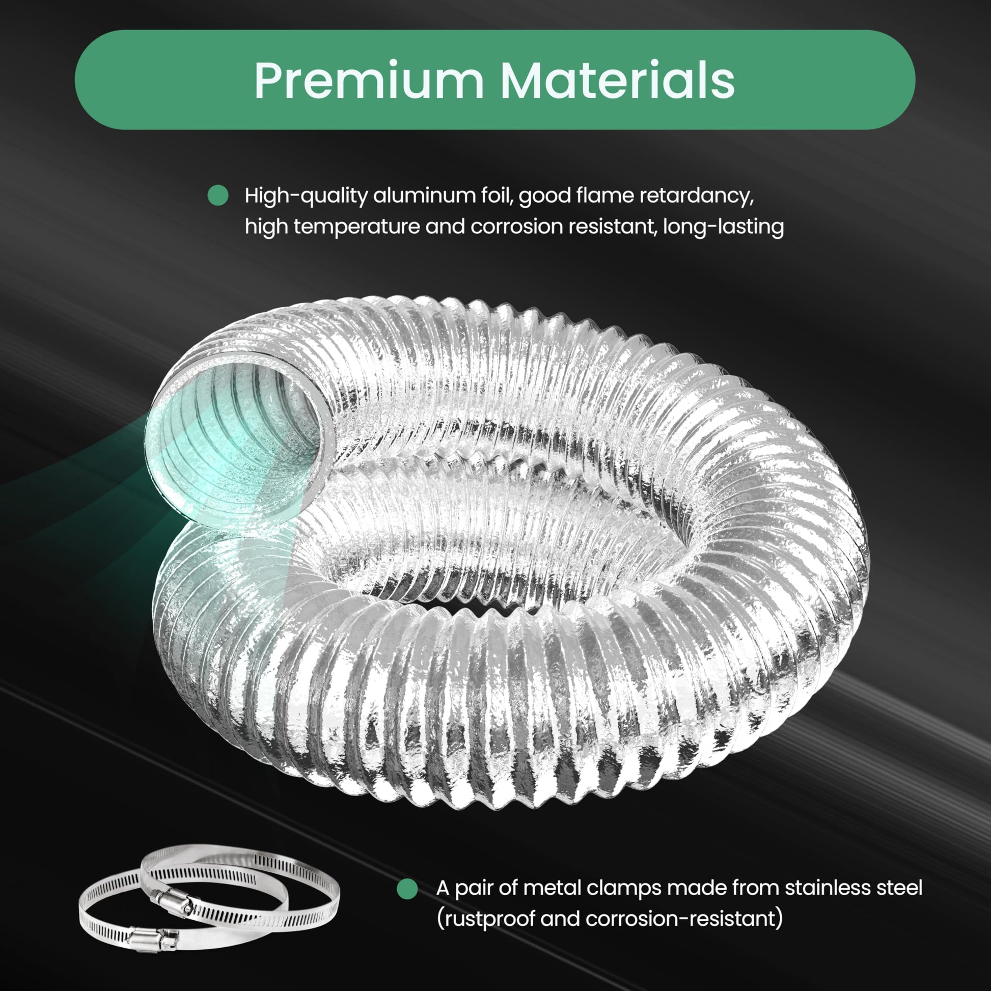 - Fire Resistant Air Duct: Dryer exhaust hose is fire resistant and no gas release in high temperature, built-in steel wire for reinforcement and long lasting performance. And the temperature range is from -30 degree to 150 degree.