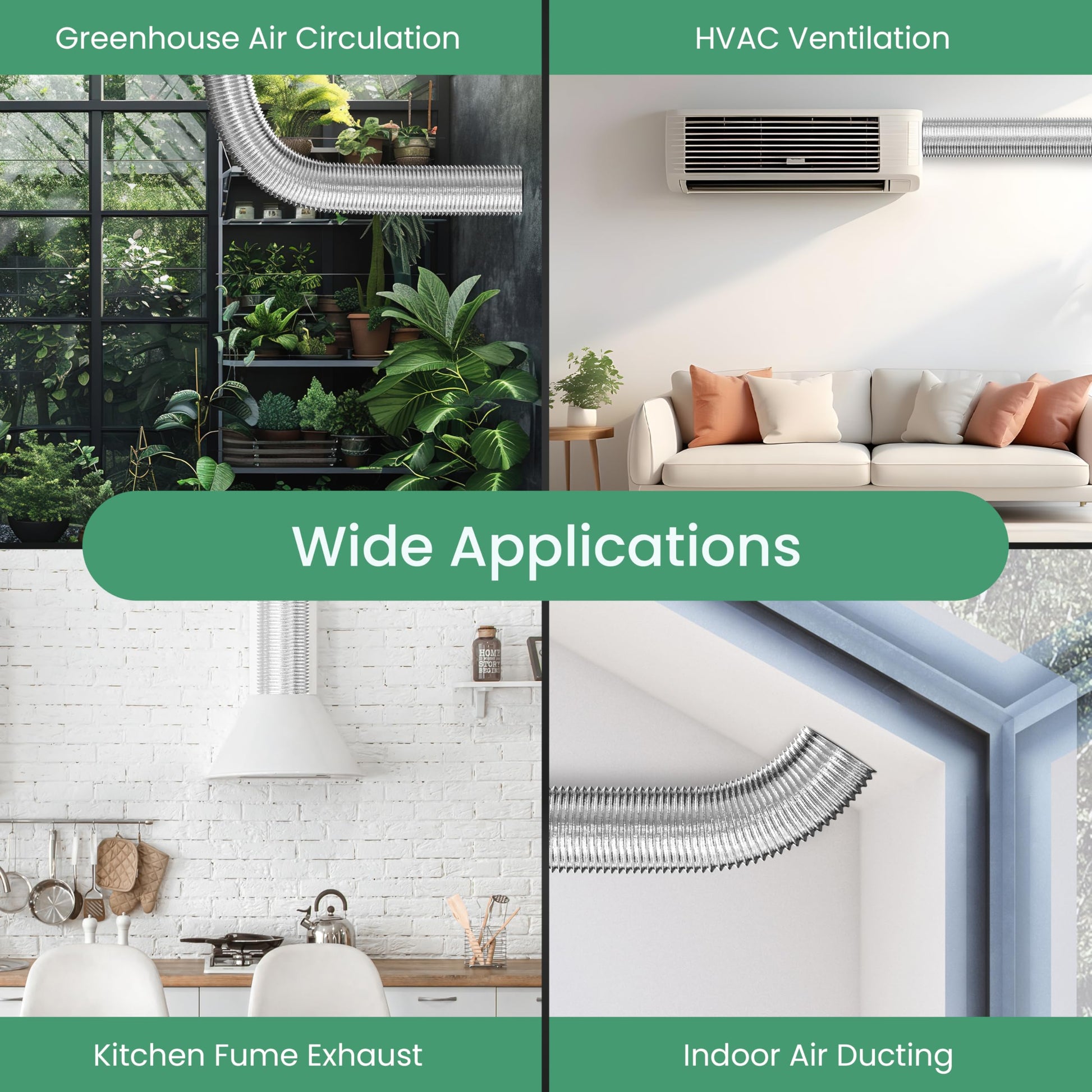 - Wide Applications: Aluminum ducting is suitable for HVAC system, it will move and deliver air in kitchens(cooking exhaust), greenhouses and growrooms(air circulation, intake, exhaust), bathrooms, dryer rooms, grow tents and other applications etc.