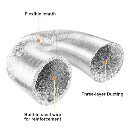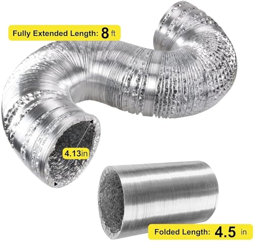 - Ducting: Material: aluminum foil + PET; size: 4 inches (diameter) x 8 feet (length) when fully extended. Temperature endurances range from 0 ~ 185°F. (-18℃ ~ 85℃). 1 pair of 4-inch metal clamps made from stainless steel