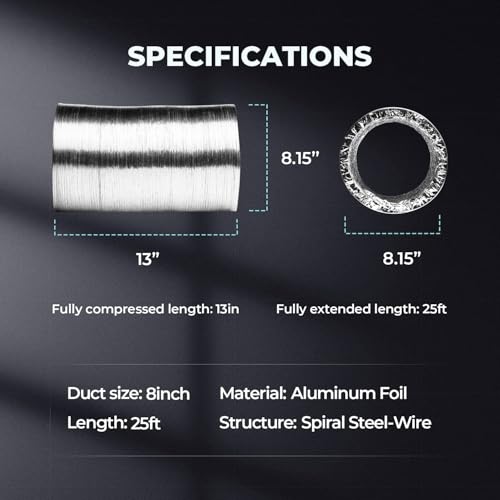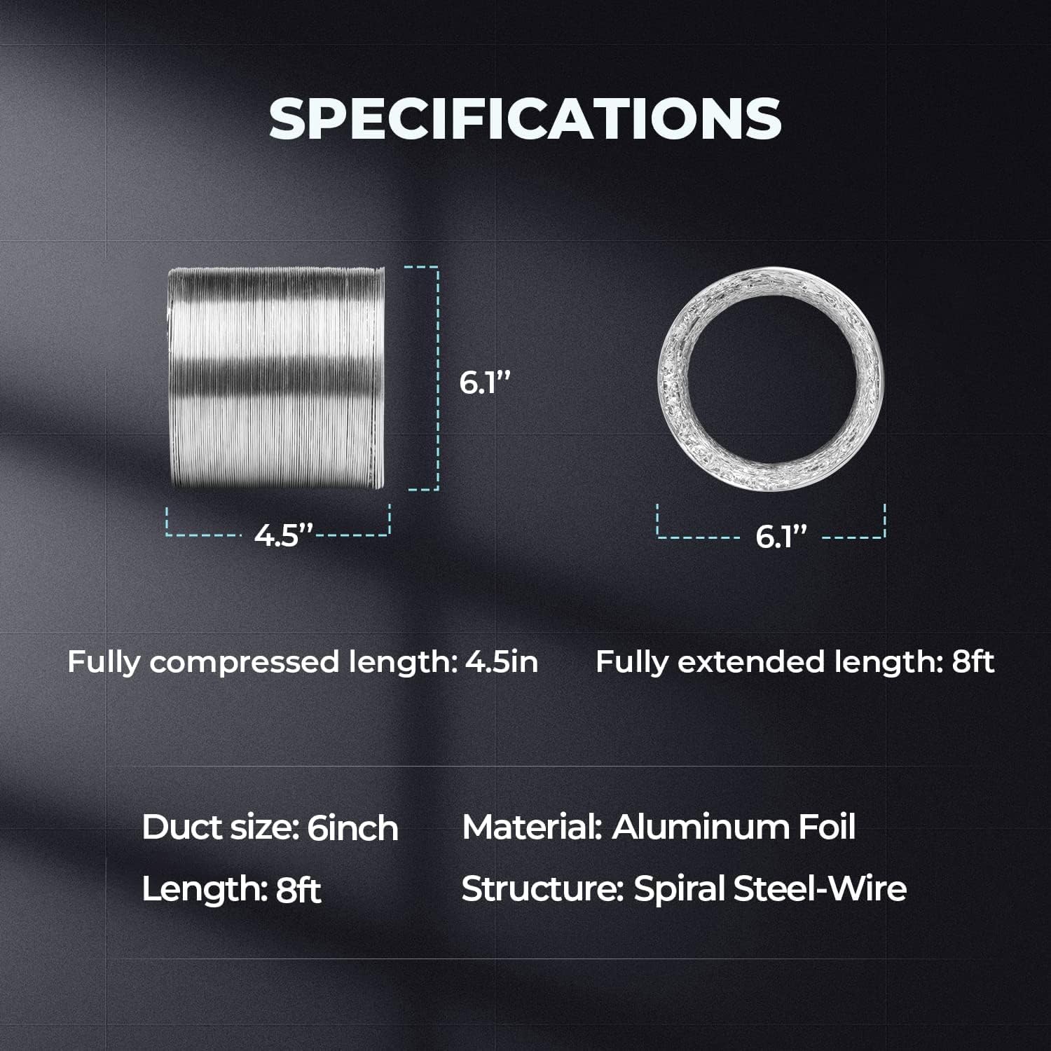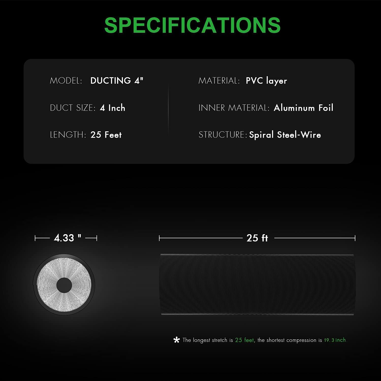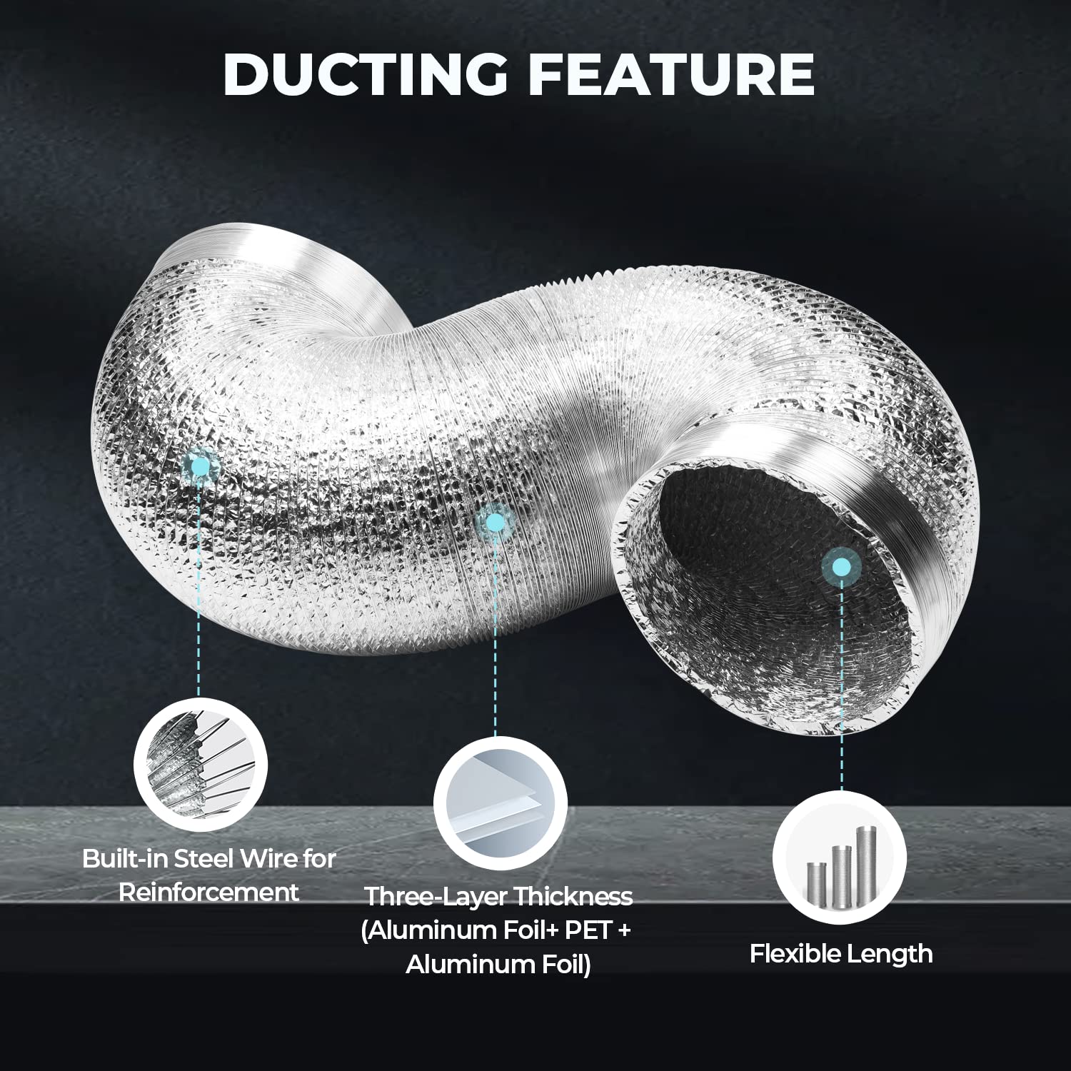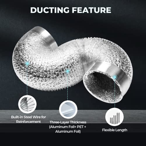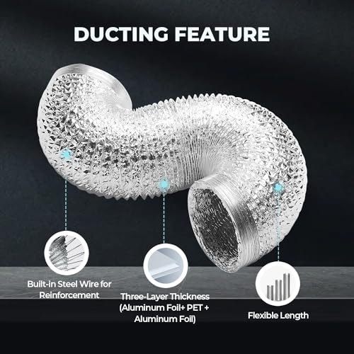- Ducting feature: built-in steel wire for reinforcement and long lasting performance. Flexible length for inline fan; when not in use, it takes up little space.