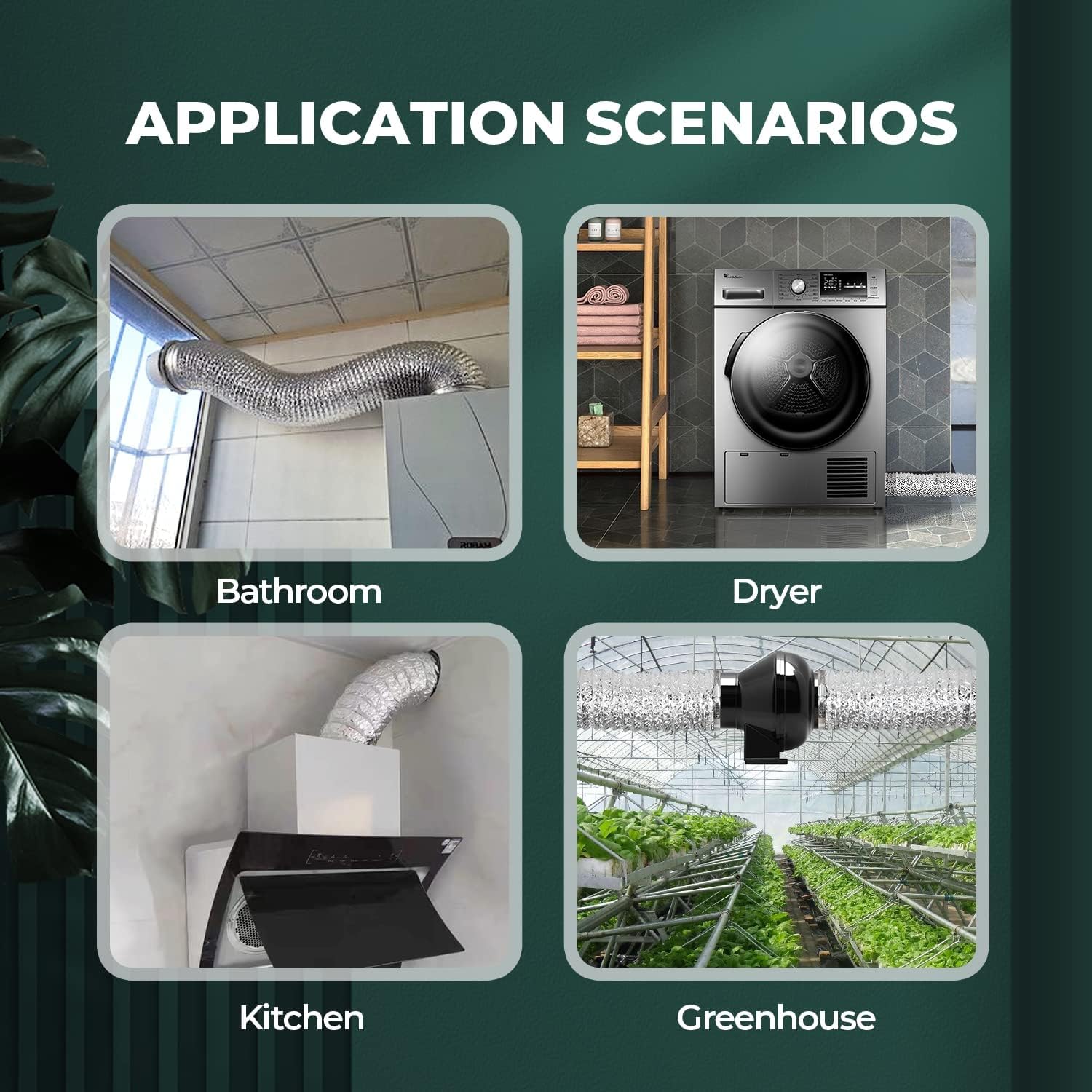 - Applications: kitchens (cooking exhaust), green houses and grow rooms (air circulation, intake, exhaust and light fixture cooling), bathrooms (smell and moisture exhaust), grow tents, etc.