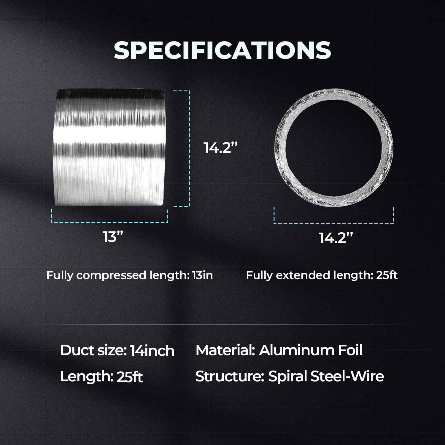 - Specs: material: Aluminum foil + PET; size: 14inches (diameter) x 25feet (length) when fully extended. Temperature endurance range from 0 ~ 185°F. (-18℃ ~ 85℃).