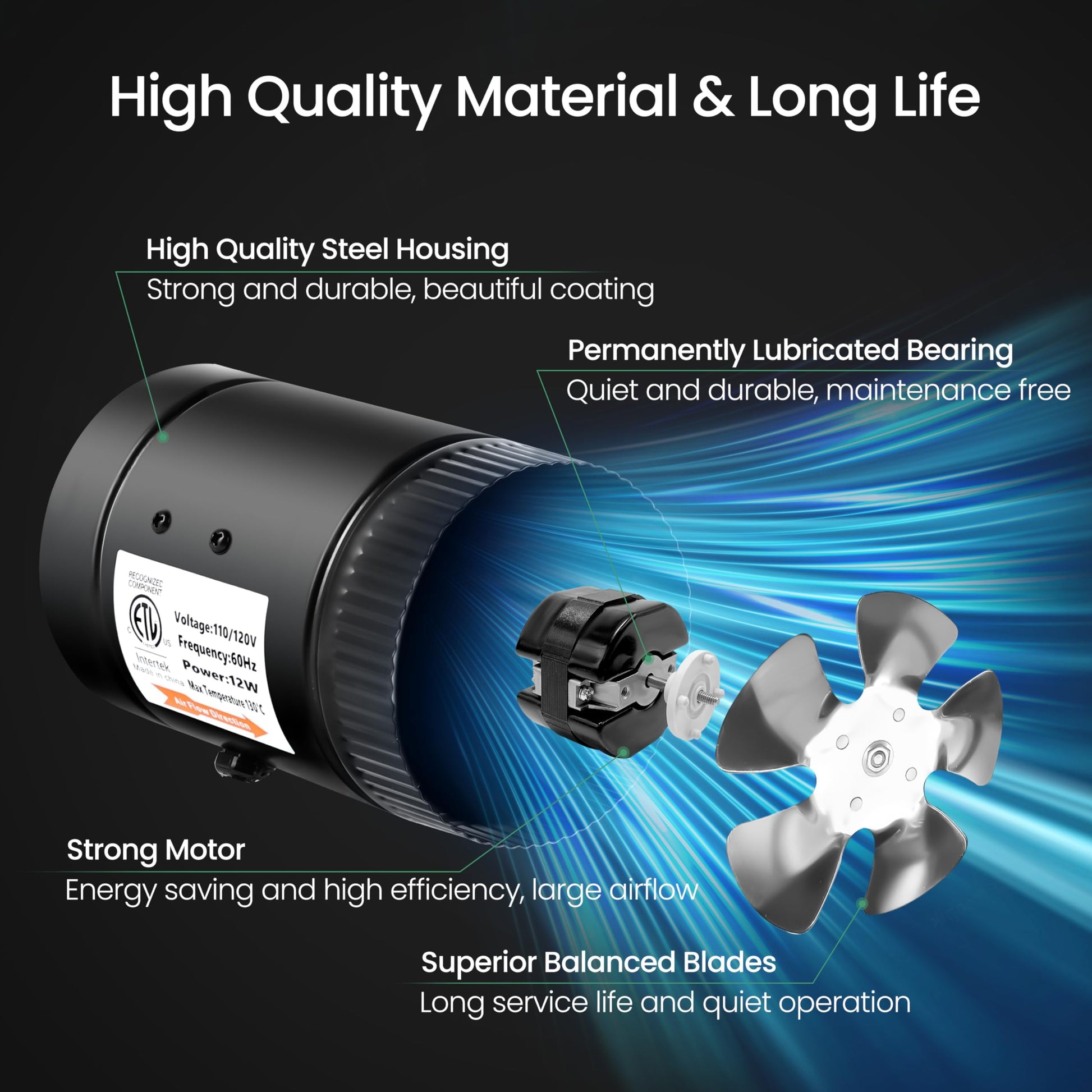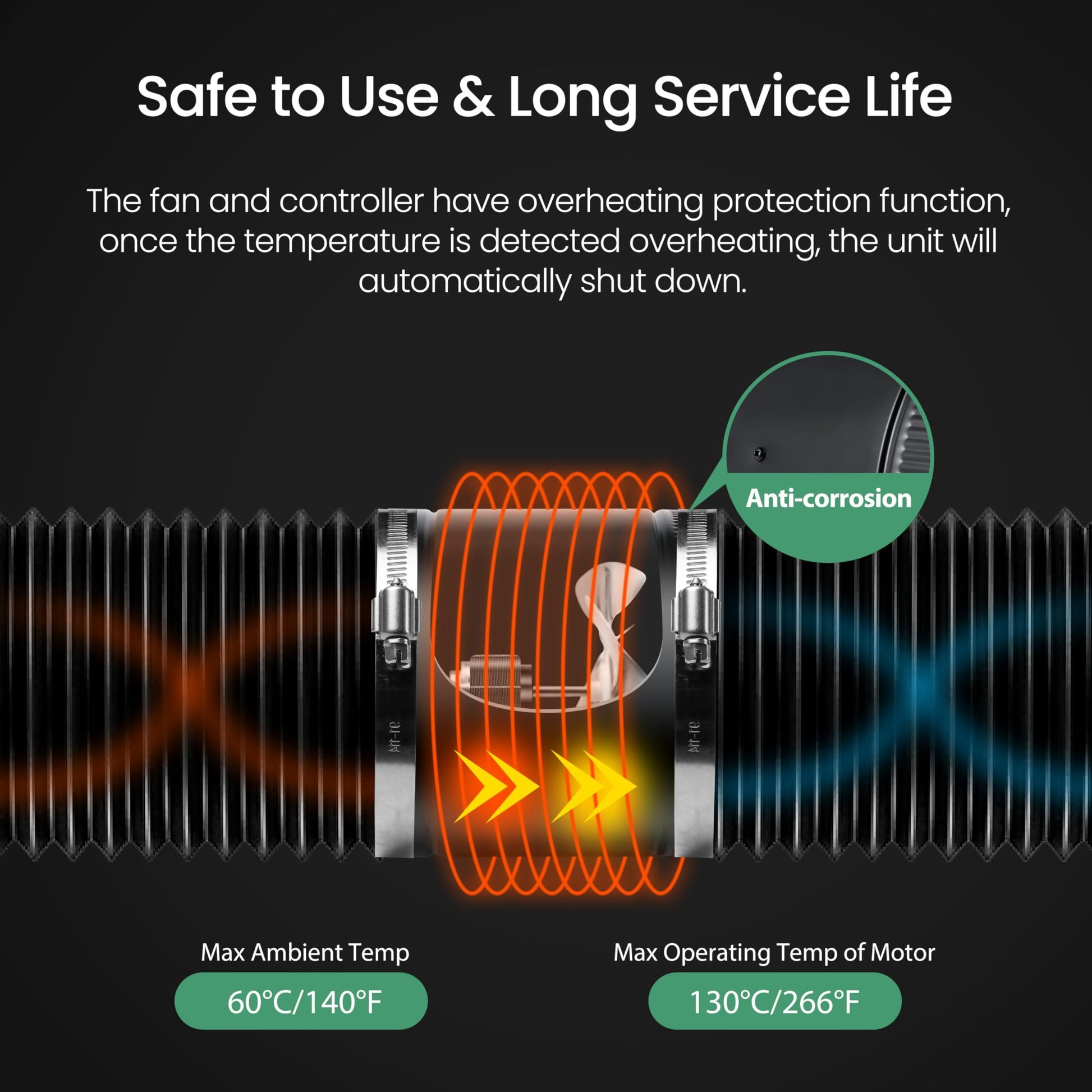 - Safe and Durable: 8 inch duct fan booster has overheating protection, and if overheating is detected, the unit will automatically shut down. The quality steel housing and strong motor makes it sturdy and built to last quality steel