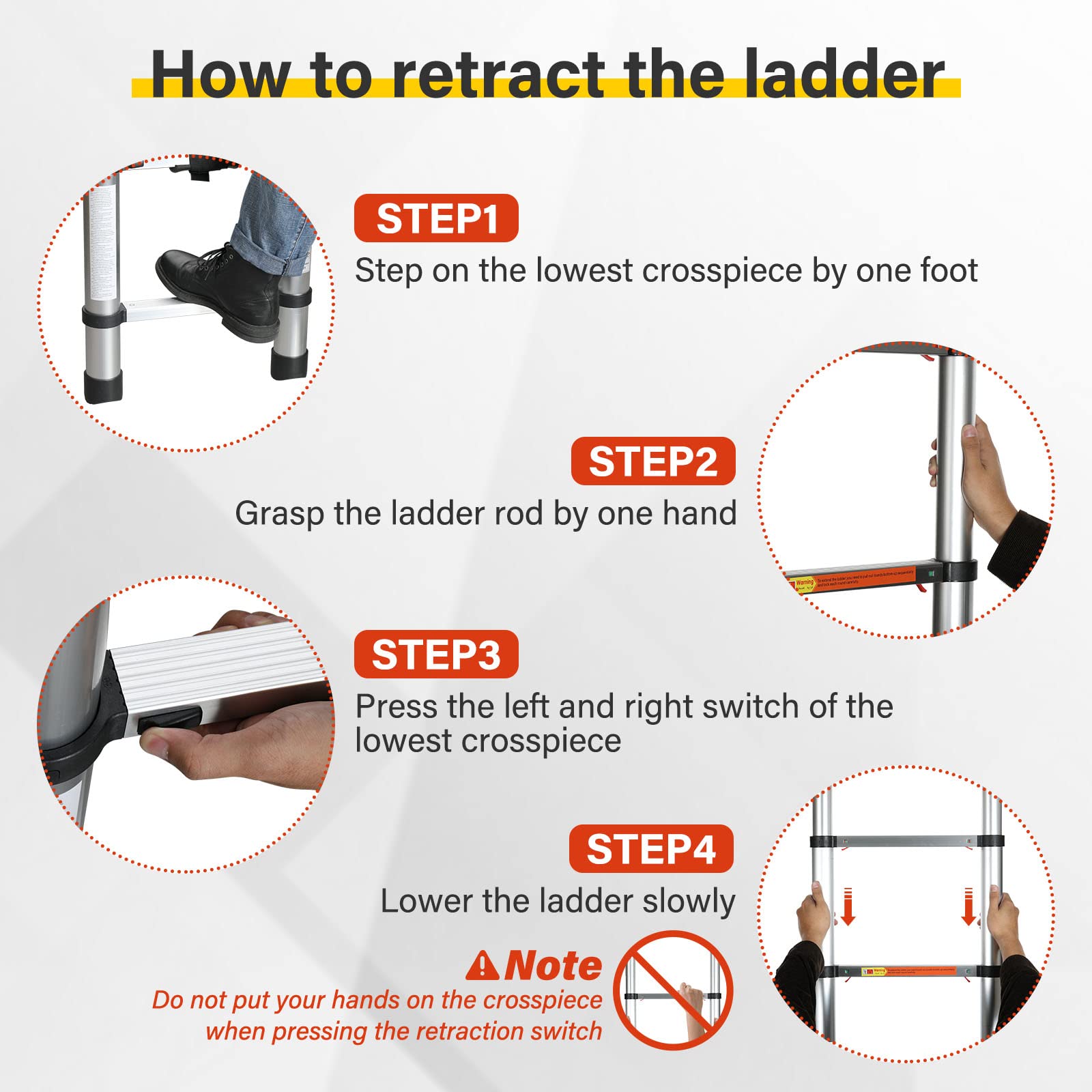 - One button retraction: One-button retraction function. The telescopic ladder will descending smoothly from the unfolded condition to compact size by simply pressing the thumb buttons. Do not put your hands in the ladder when retracting it