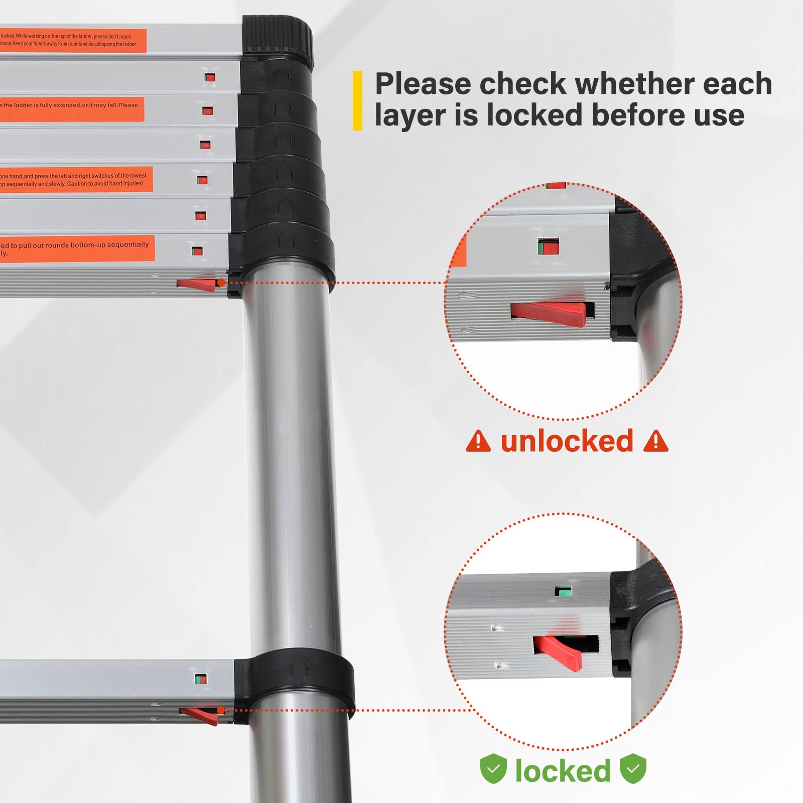 - Safe & stable: Each rung has a double height-locking latch, allowing you adjust to different heights with anti-pinching finger function. Every pedal is striated for increased friction, anti-slip rubber feet, easy to secure the ladder to wall/floor