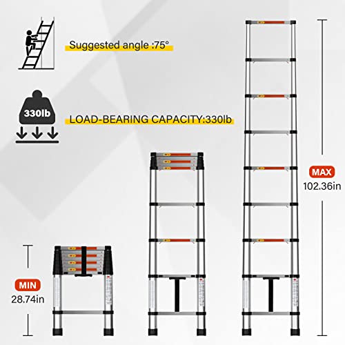 - Premium materials: The ladder is made of corrosion-resistant aluminum alloy with anodized finish. Plastic parts are reinforced with nylon fiber which ensures a long service life. Height max: 8.5 FT; Weight capacity: 330lbs, Don't stand at the top