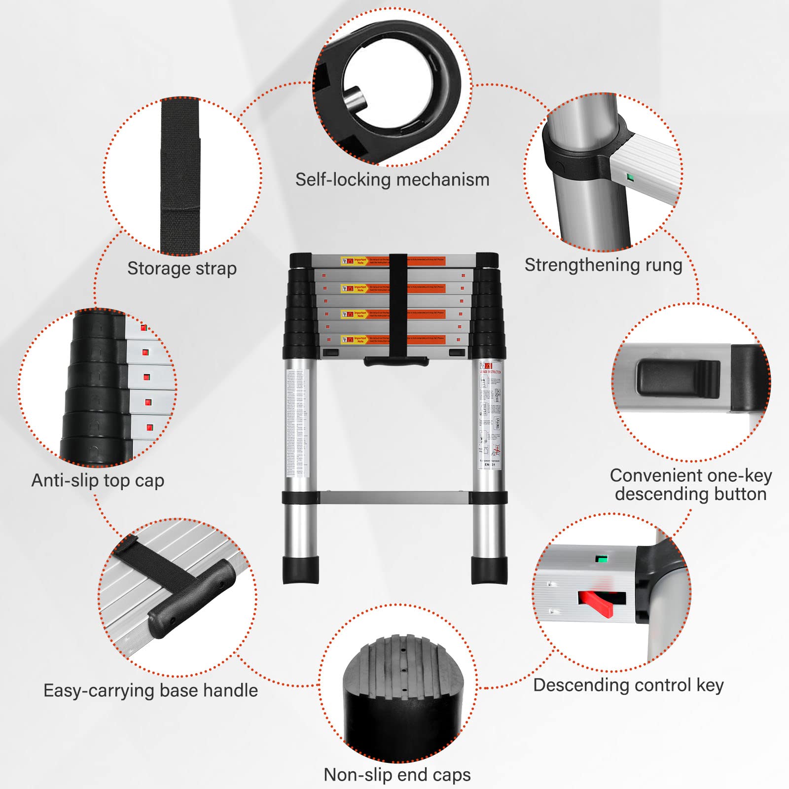 - Portable & compact: The aluminum telescoping ladder can be retracted to about a quarter of its height. By using the heavy-duty securing strap, you can carry the ladder with one hand. Lightweight, compact, convenient and space-saving to store it