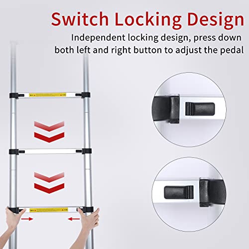 - One button retraction: One-button retraction function. The telescopic ladder will descending smoothly from the unfolded condition to compact size by simply pressing the thumb buttons. Do not put your hands in the ladder when retracting it