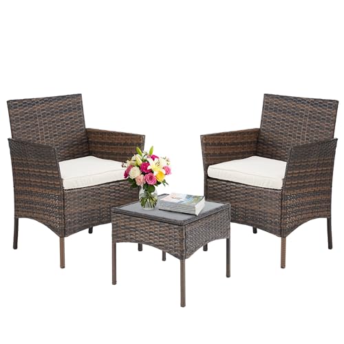 Simple Deluxe 3-Piece Patio Set, PE Rattan Chairs with Cushions & Glass Table, Waterproof Outdoor Conversation Set for Garden, Backyard, Balcony