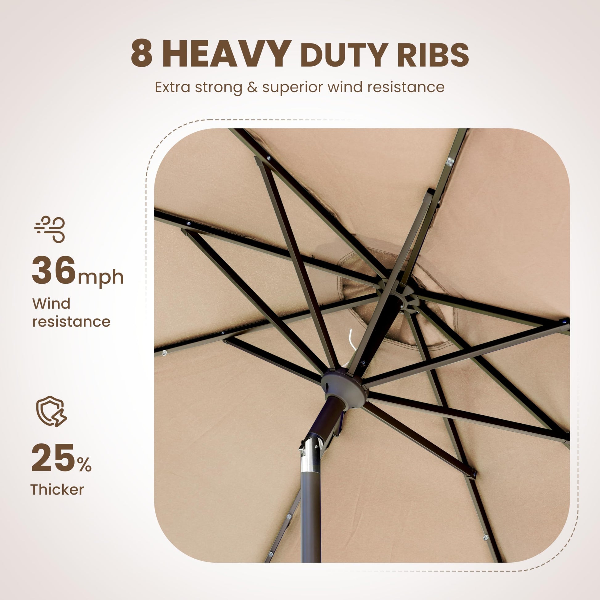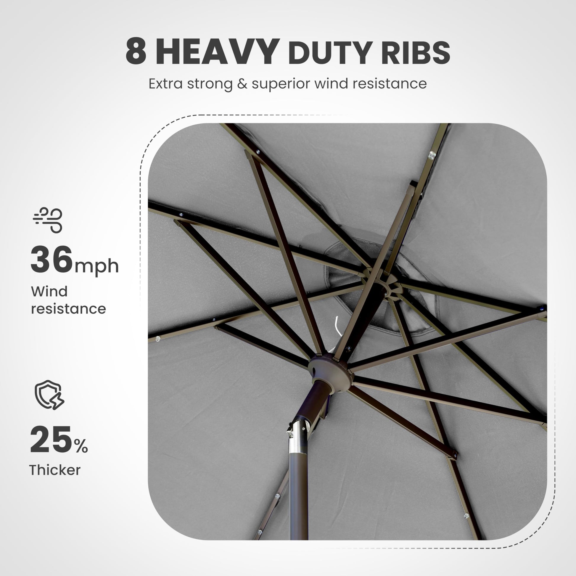 - High-Quality & Durable Material: The patio umbrella fabric is made of 100% polyester. which is water & UV resistant. Our patio umbrella is made of 8 heel stainless steel heavy-duty ribbed brackets, which make it perform better in wind and rust resistance