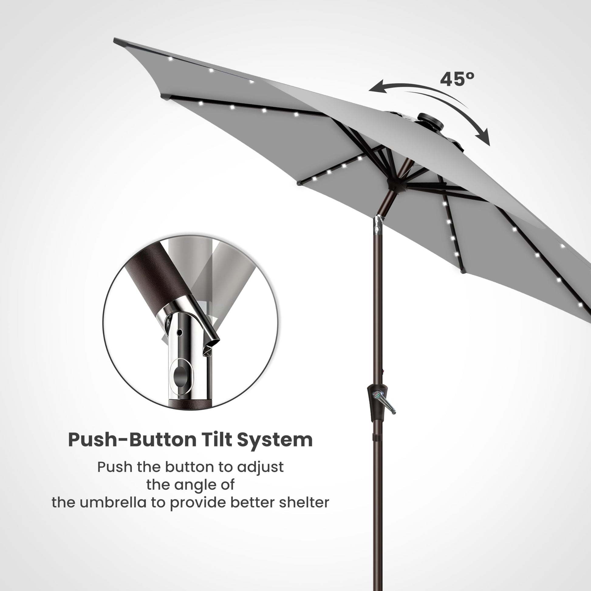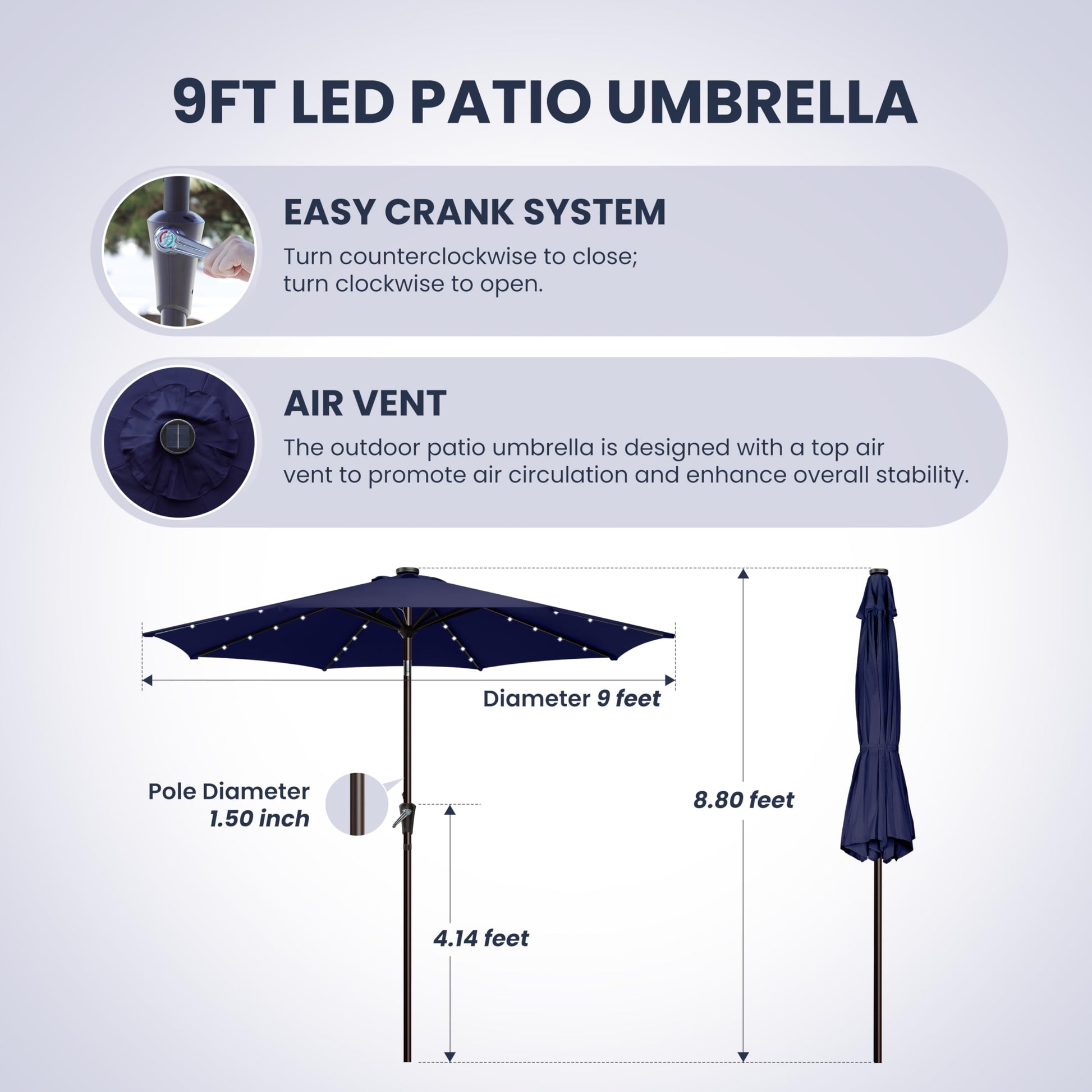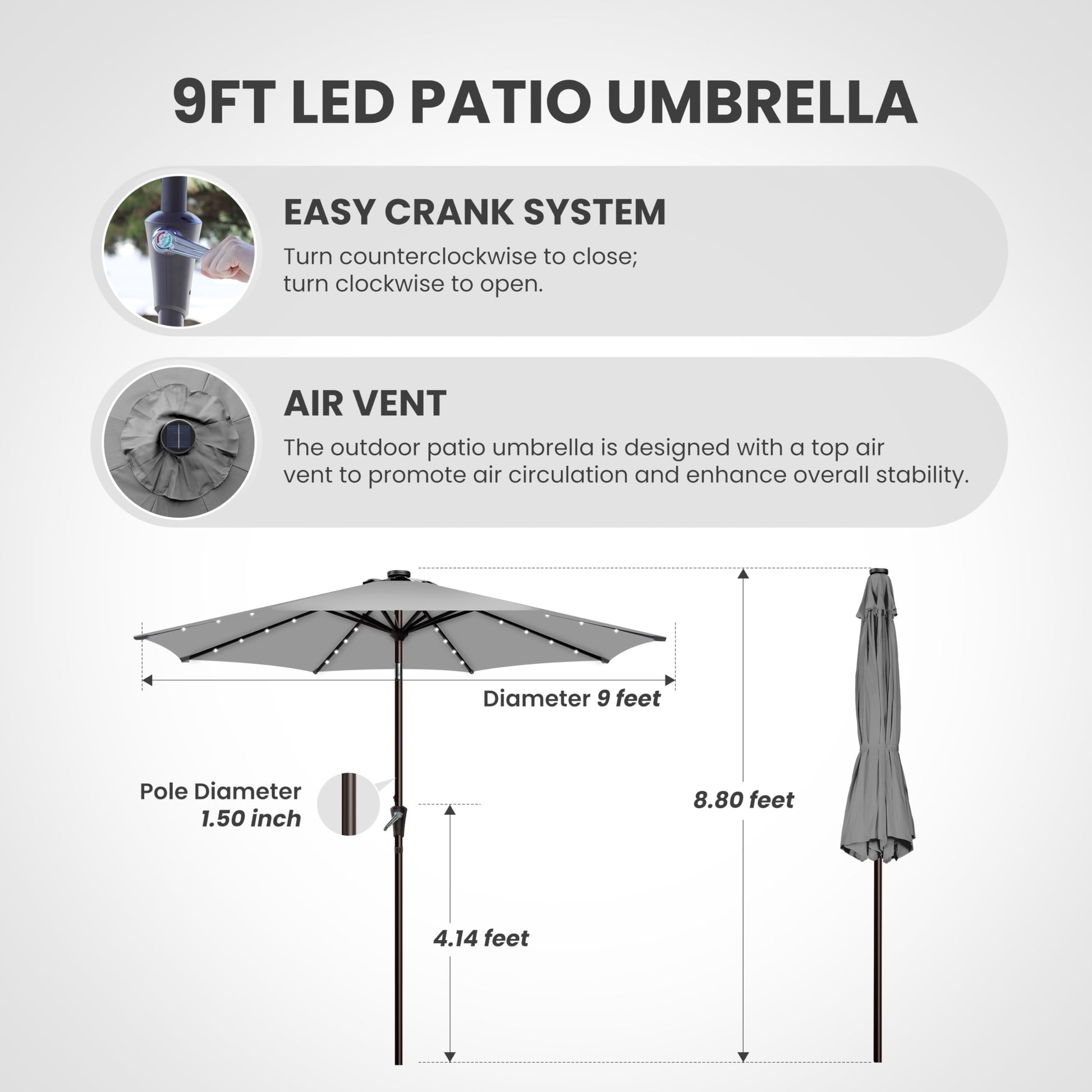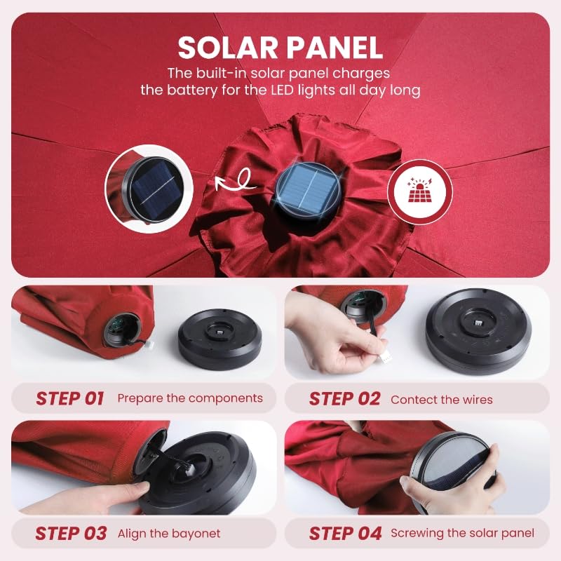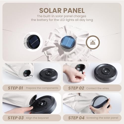- Easy to Install: The crank lift mechanism of our patio umbrella makes it easy to open and close in seconds, easy tilt operation with push button for more angles. On and off switch for umbrella solar light, which also needs be turned off in the daytime