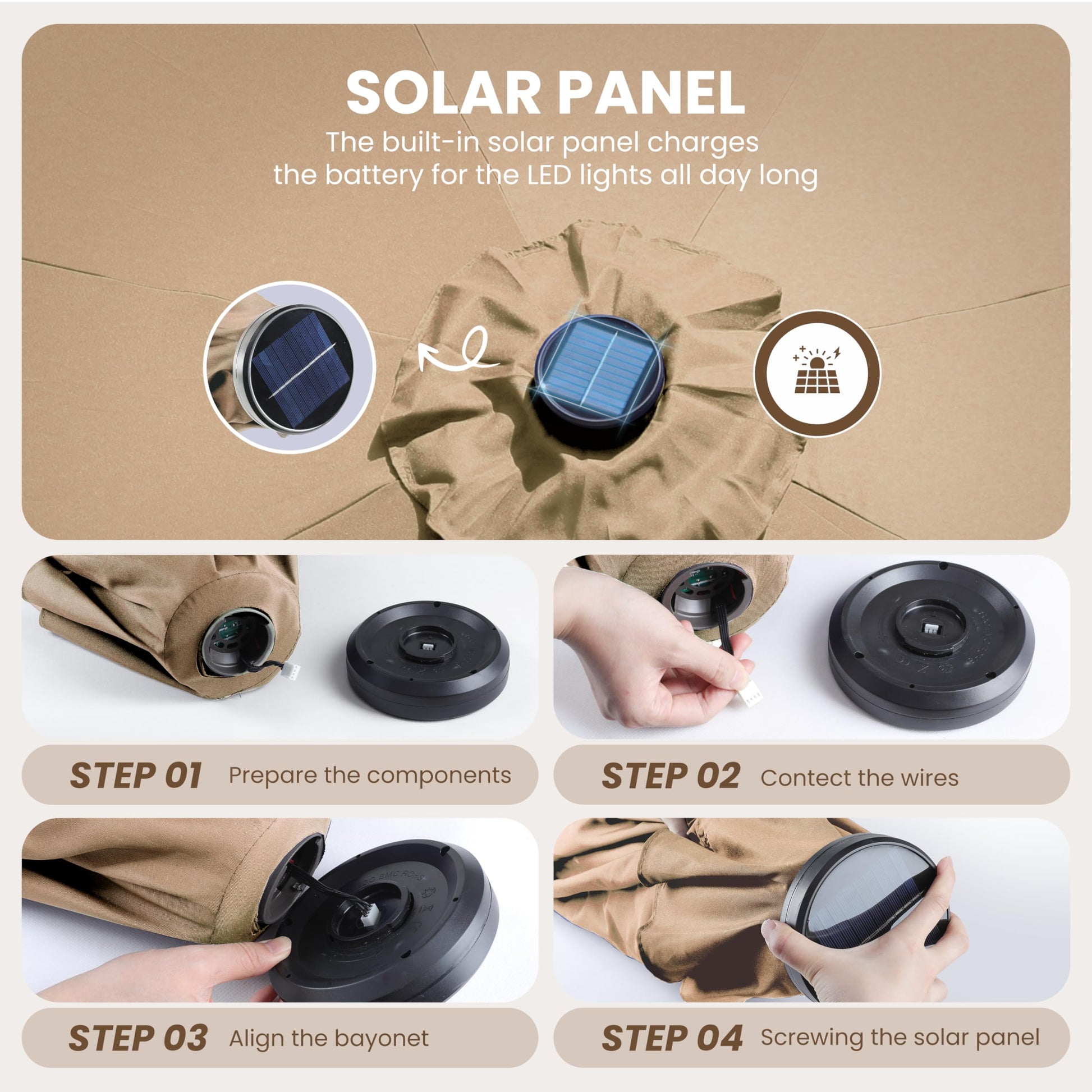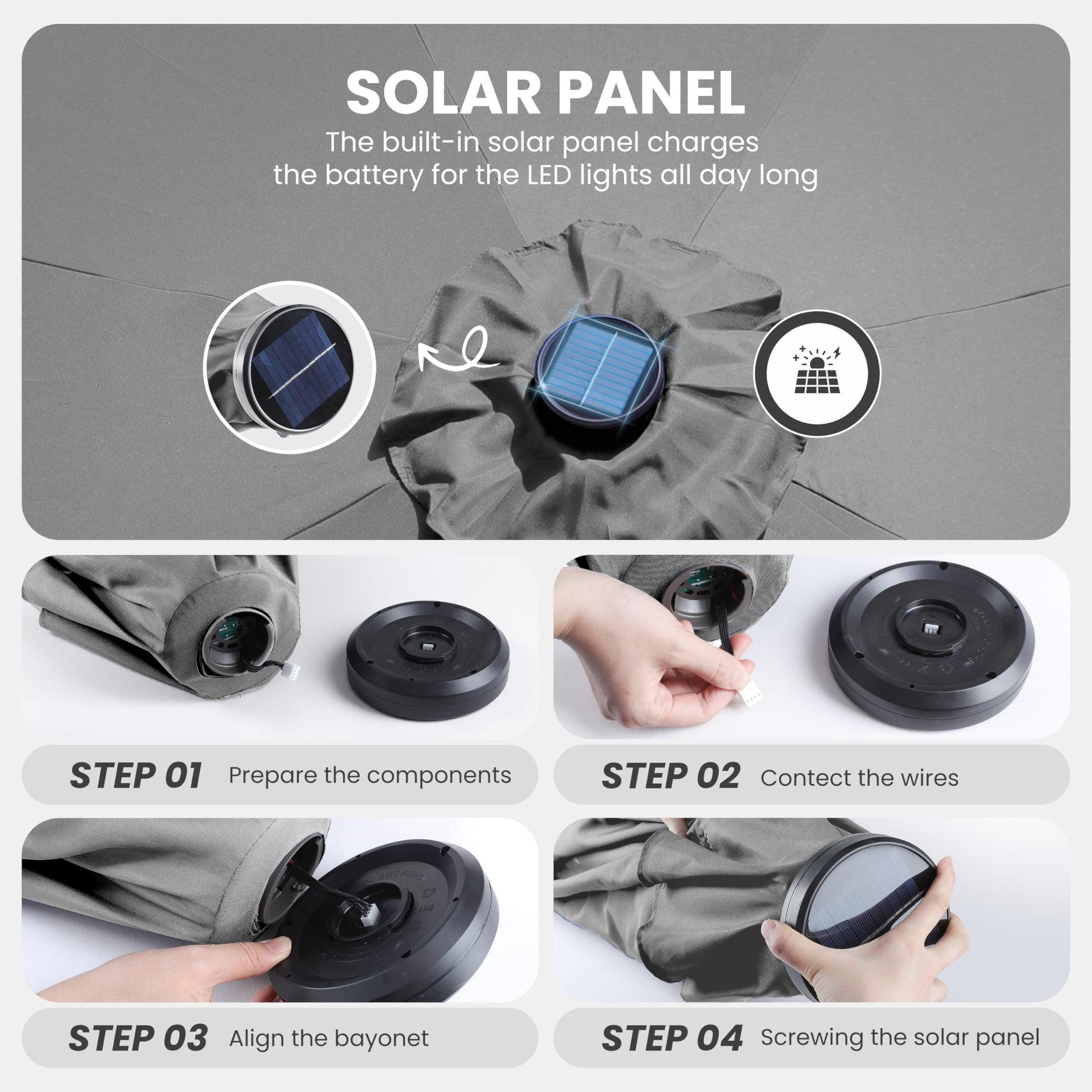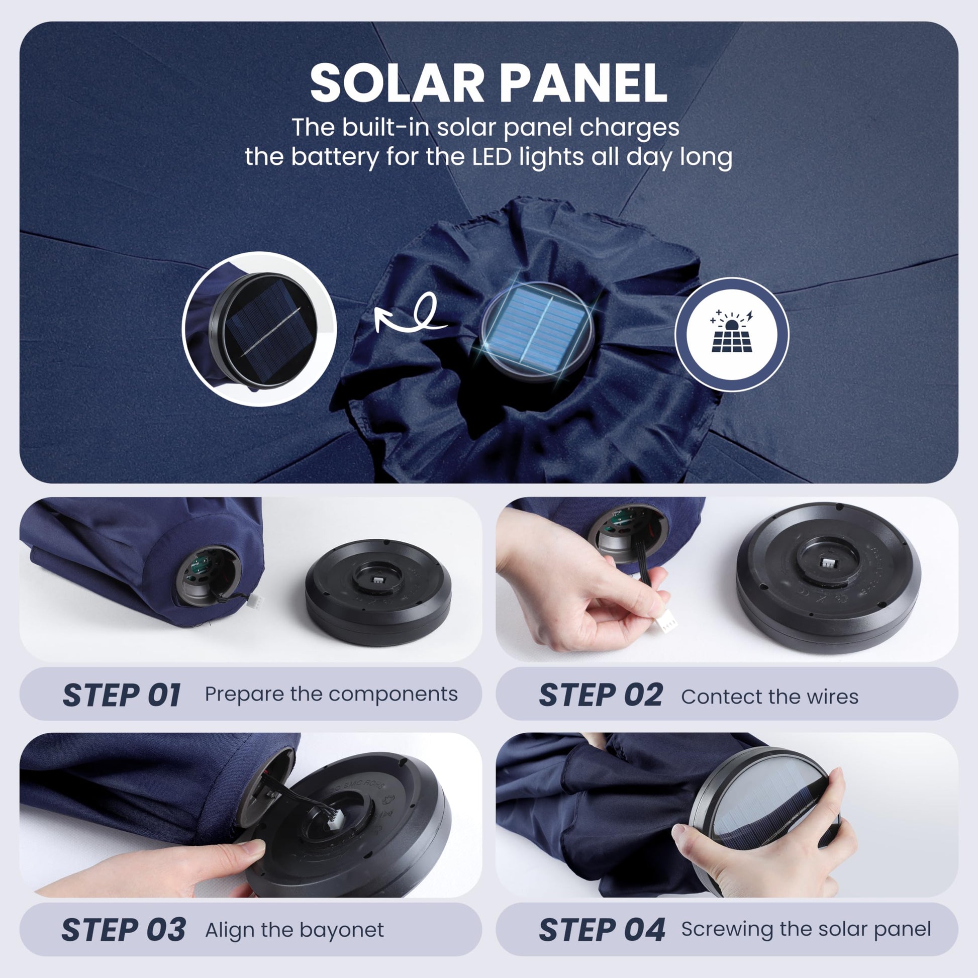 - Energy-Efficient Lighting: Solar-powered 32 LEDs provide energy-efficient lighting with rechargeable NiMH battery,1800AM, 4 LED lights on each rib, 8 steel rib construction. The solar can work for 6-7 hours when battery is in full status
