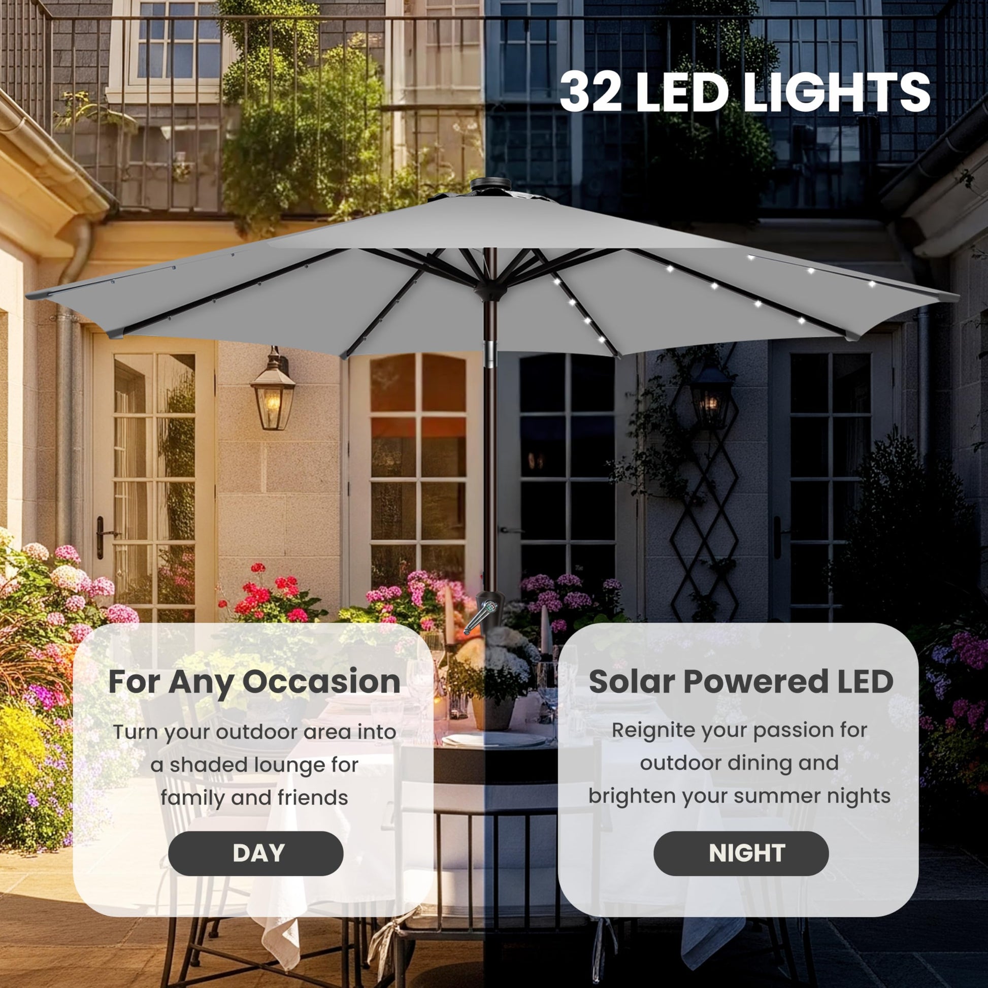 - Wide Applicable: Our 9' LED lighted Umbrella is perfect for a 42"- 54" table with 4 to 6 chairs, is a perfect and essential for summer or sunny day, add a festive mood to any occasion, apply to yards, beaches, gardens, patios, cafe, pools, picnics, BBQ's