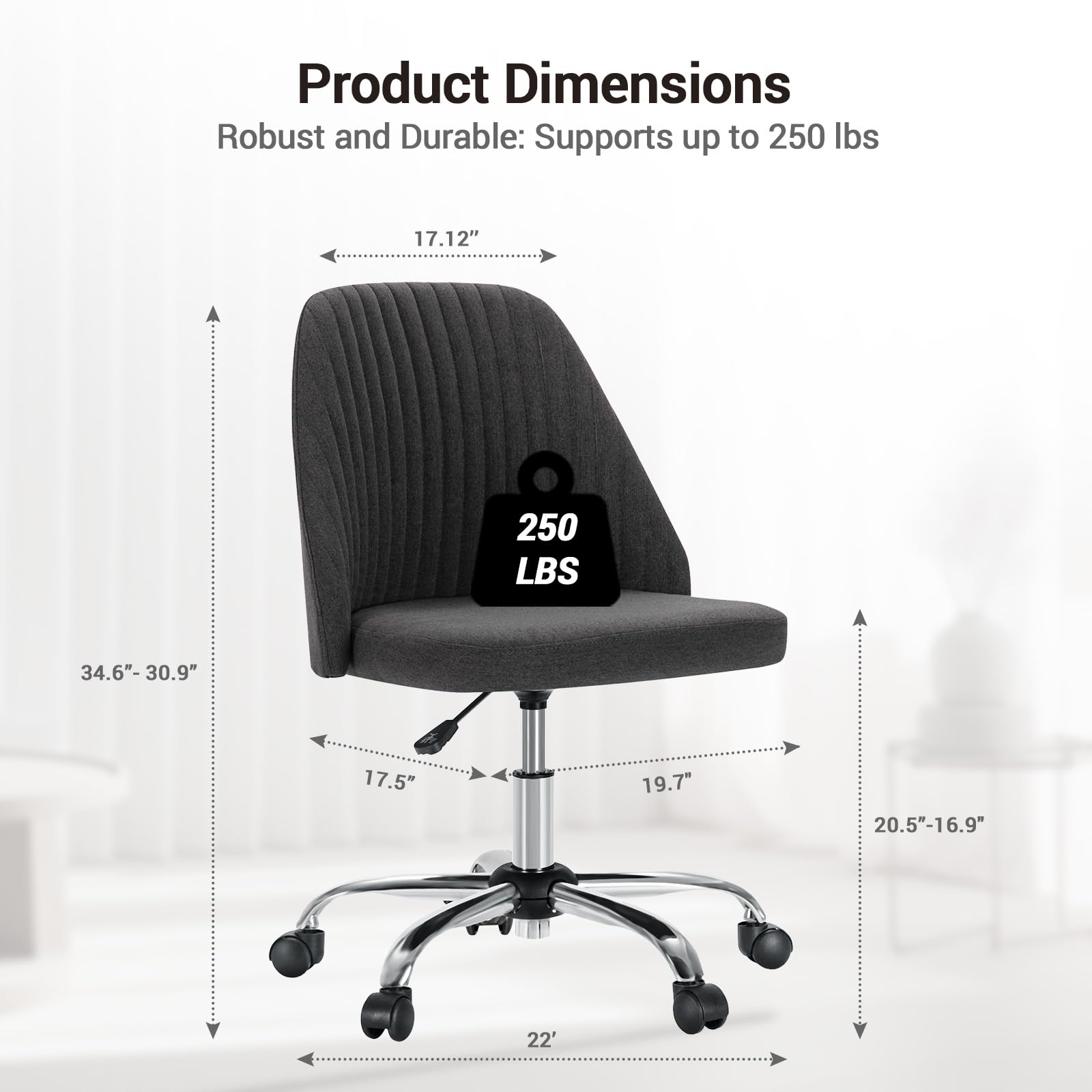 Simple Deluxe Office Desk Chair with Back and Wheels Computer Fabric Chair Armless Adjustable Height Comfy Vanity Chair with Swivel Rolling Home Chairs for Bedroom Adult Dark Grey