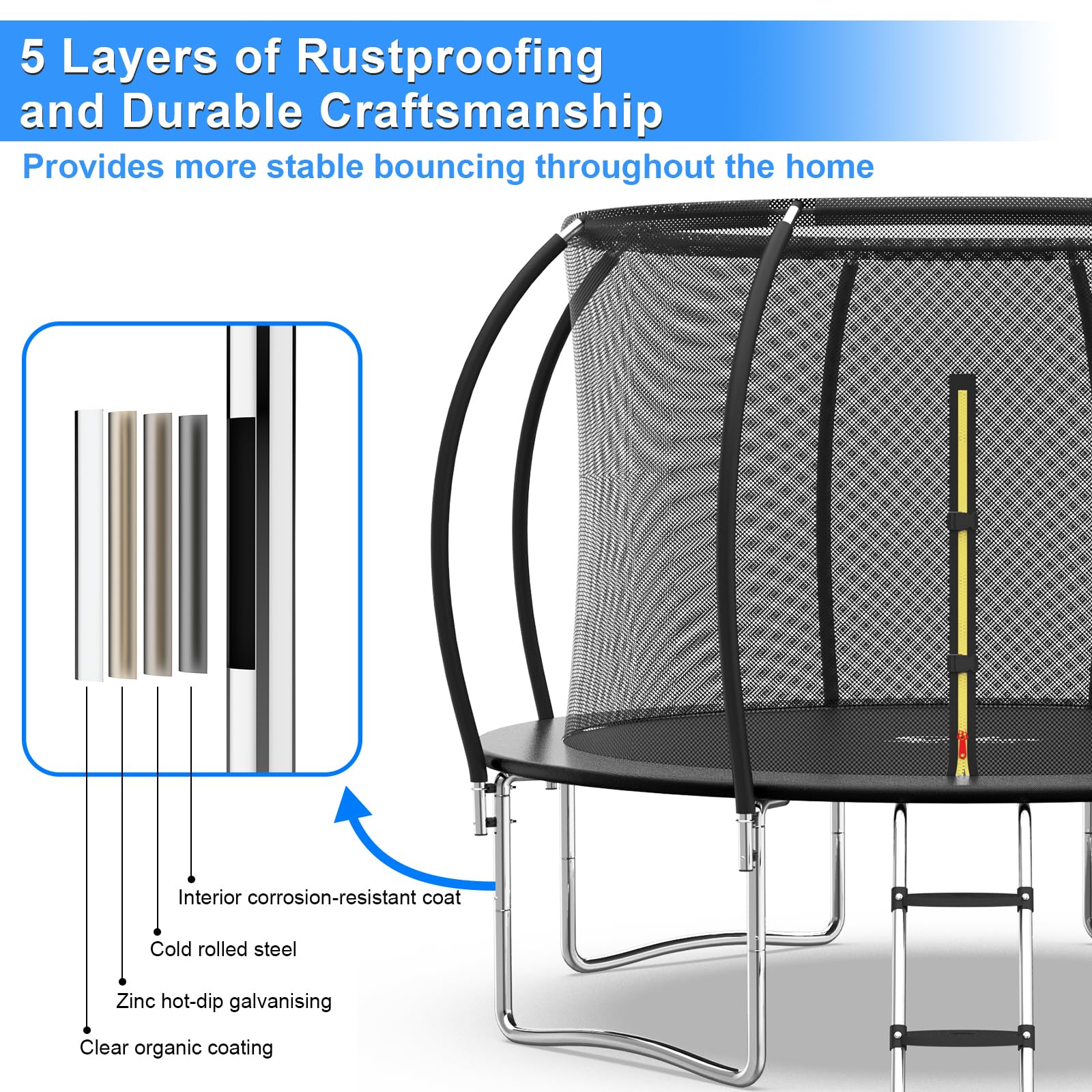 - 【Better Experience】Our trampoline is wrapped in 72 high-tension steel springs of thickened springs and good elasticity, which ensures long-term use. Our trampoline has been tested for 30,000 jumps. Mats are tested up to 6,000 hrs and can hold up to 400lbs. We have gone the extra mile and added the luxury plastic covered ladder for easy access and a comfortable use.