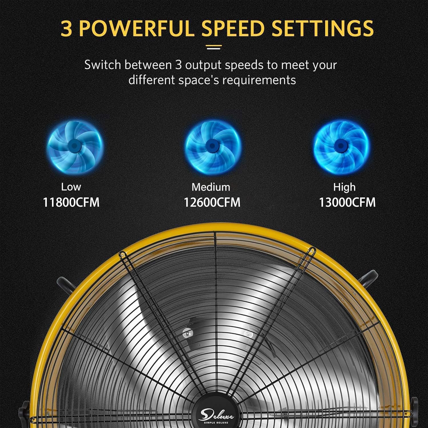 - 24 Inches metal drum fan from Simple Deluxe is ideal for garages, basements, covered patios, workshops or even warehouse and factory stations. Voltage:120 volts.Number of speeds:3