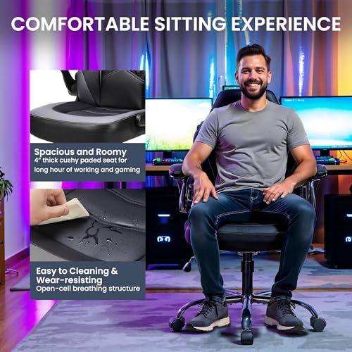 - 【DESIGNED FOR COMFORT】Crafted with premium PU leather, this chair boasts a breathable, hollowed-out backrest and multi-line design for added aesthetic appeal. The thick, concave cushion provides hip support, while the dual-color scheme enhances the room's ambiance. Ideal for long gaming or working sessions.