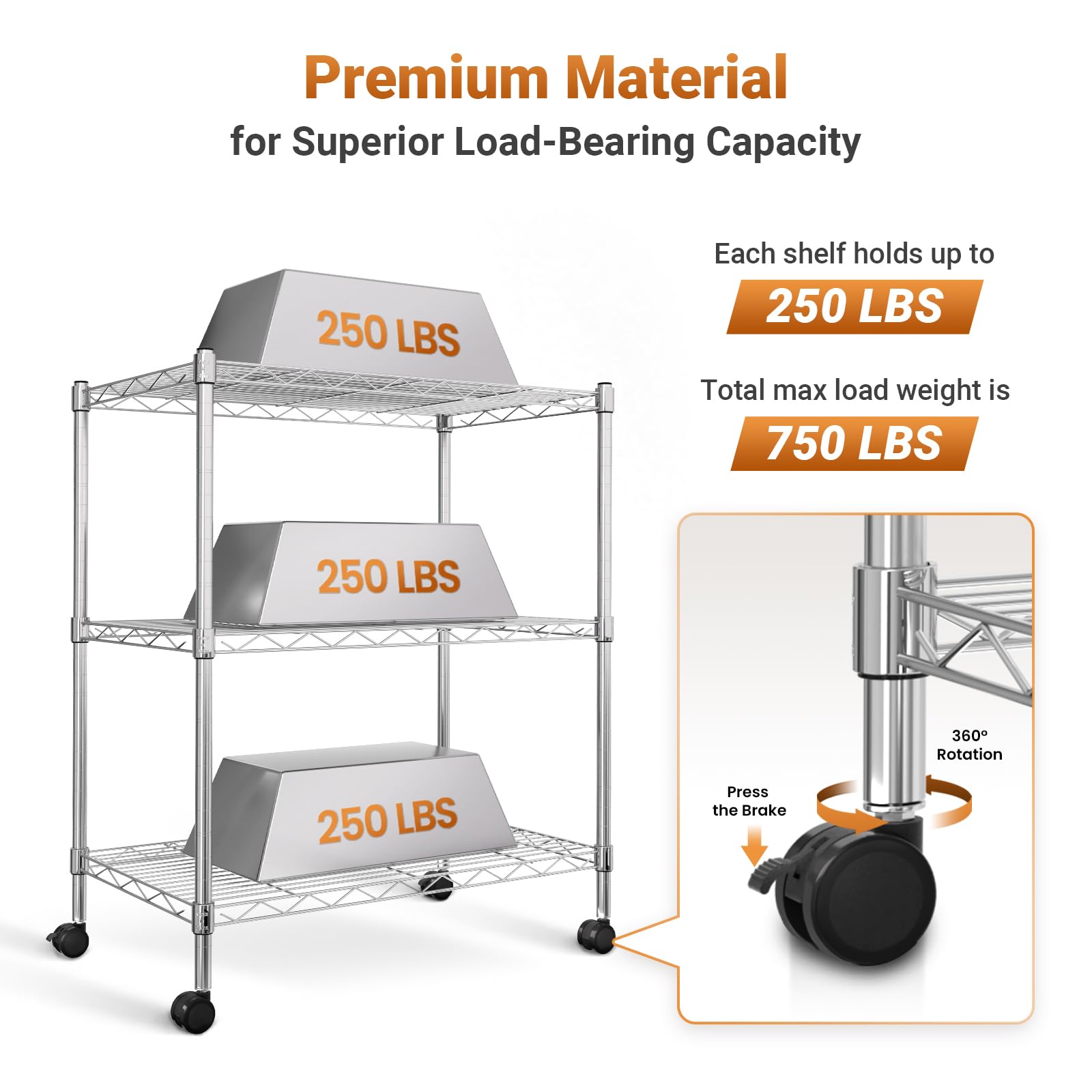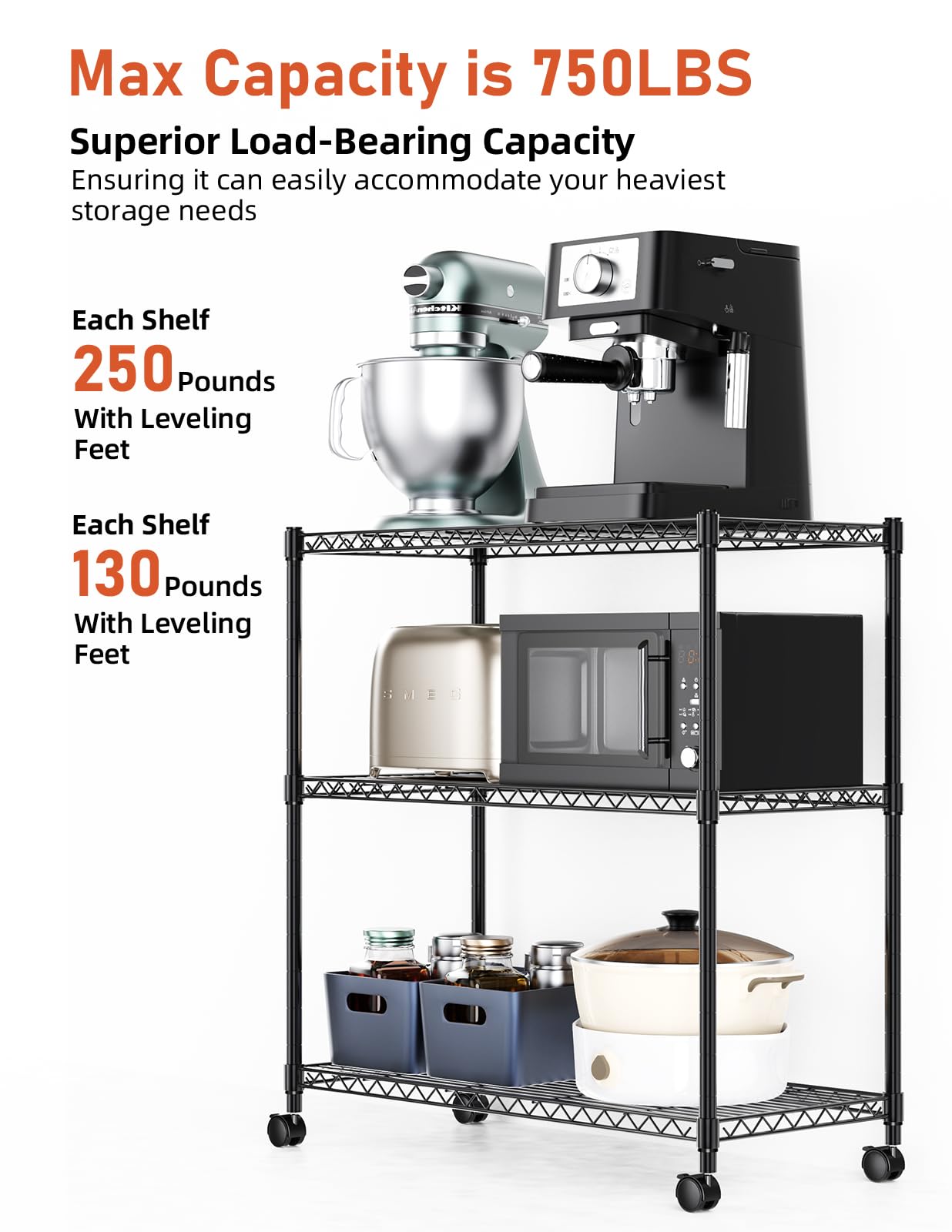 - Heavy Load Capacity - Each shelf supports up to 250 lbs (evenly distributed), with a total max weight capacity of 750 lbs