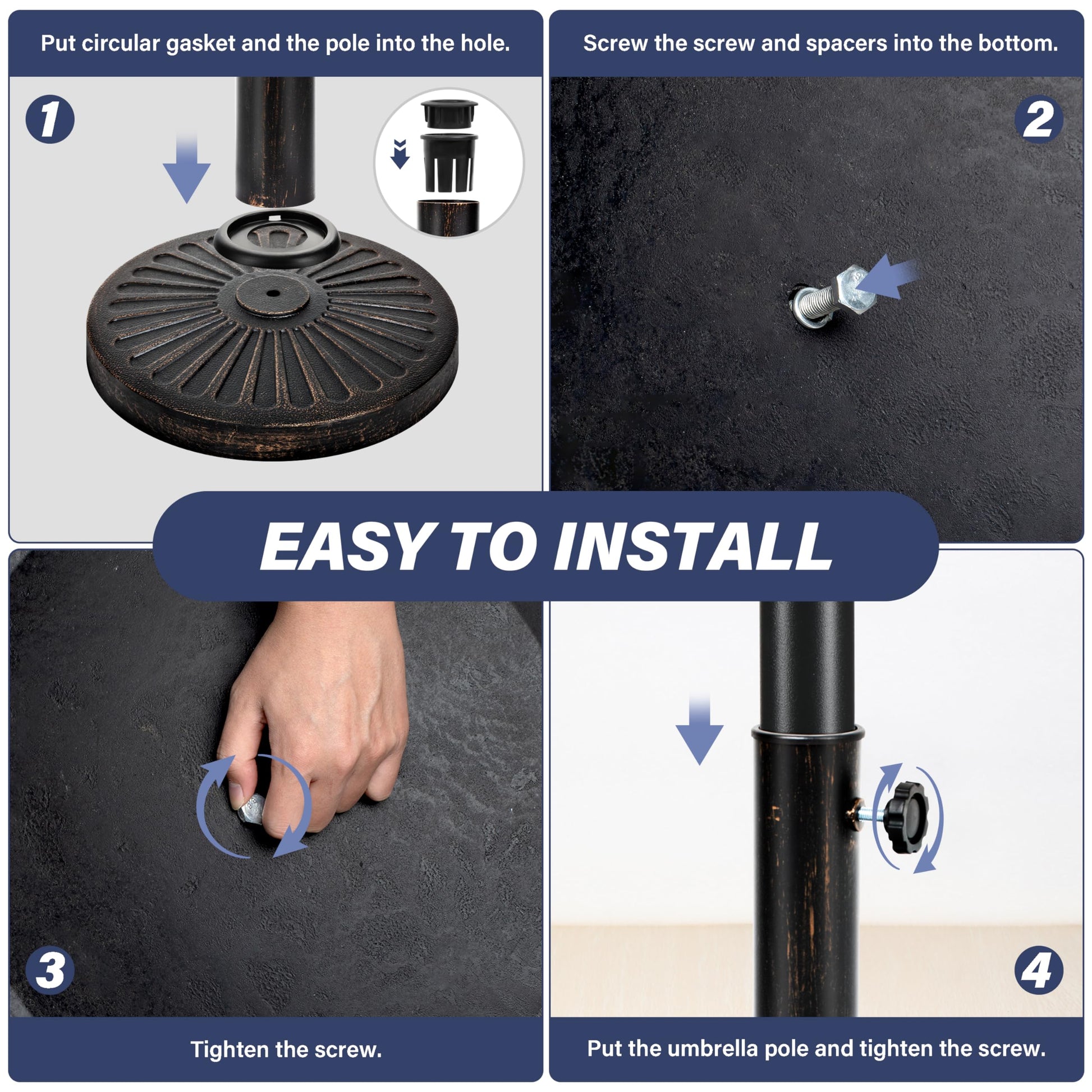 - Easy to assemble: The base holds various umbrella sizes. Plastic insert on top of steel tube is ideal for Φ1.5"(38mm)-Φ1.9"(48mm) umbrella pole. You just need to insert the umbrella pole into the base, and tighten the knobs